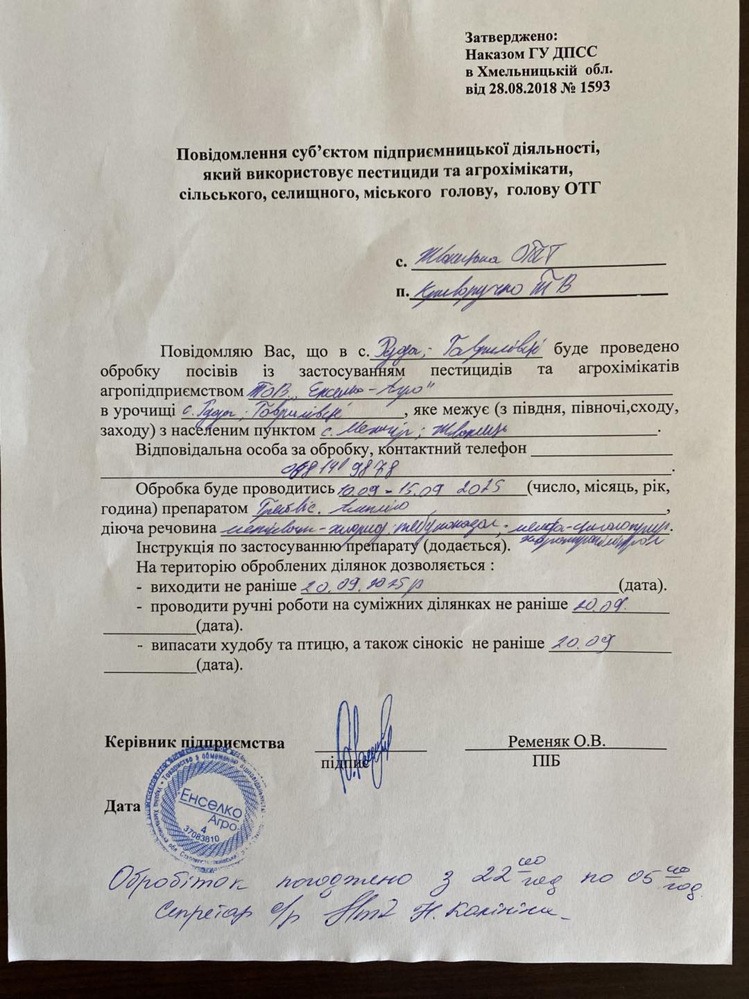 Інформуємо вас про те, що в період з 10 по 15 вересня 2025 року буде здійснюватися обробка сільськогосподарських угідь із застосуванням пестицидів та інших агрохімікатів. Ці роботи виконуватимуться суб’єктом підприємницької діяльності.