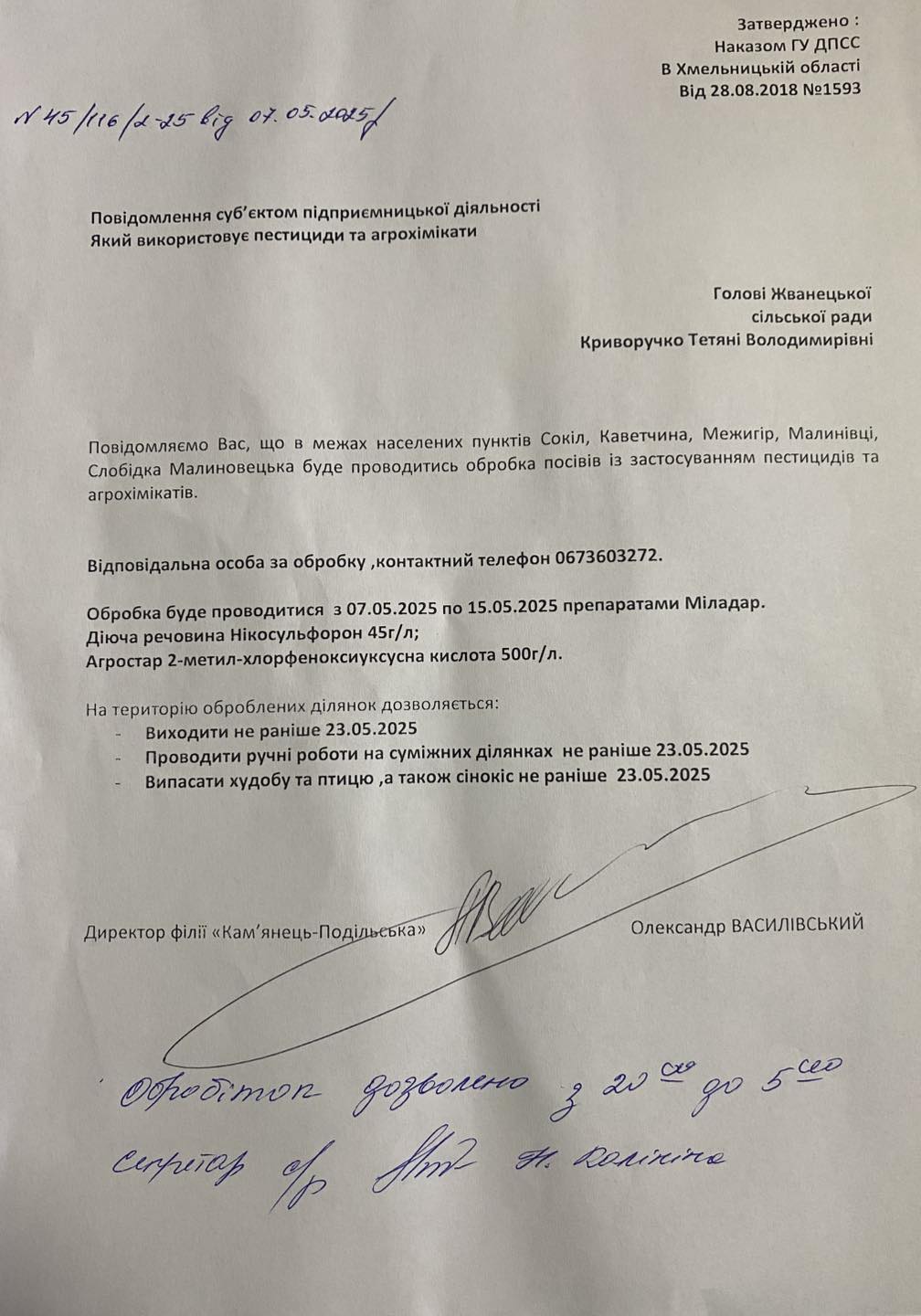 Жванецька ТГ: Обробка угідь пестицидами з 07.05 – Важлива інформація