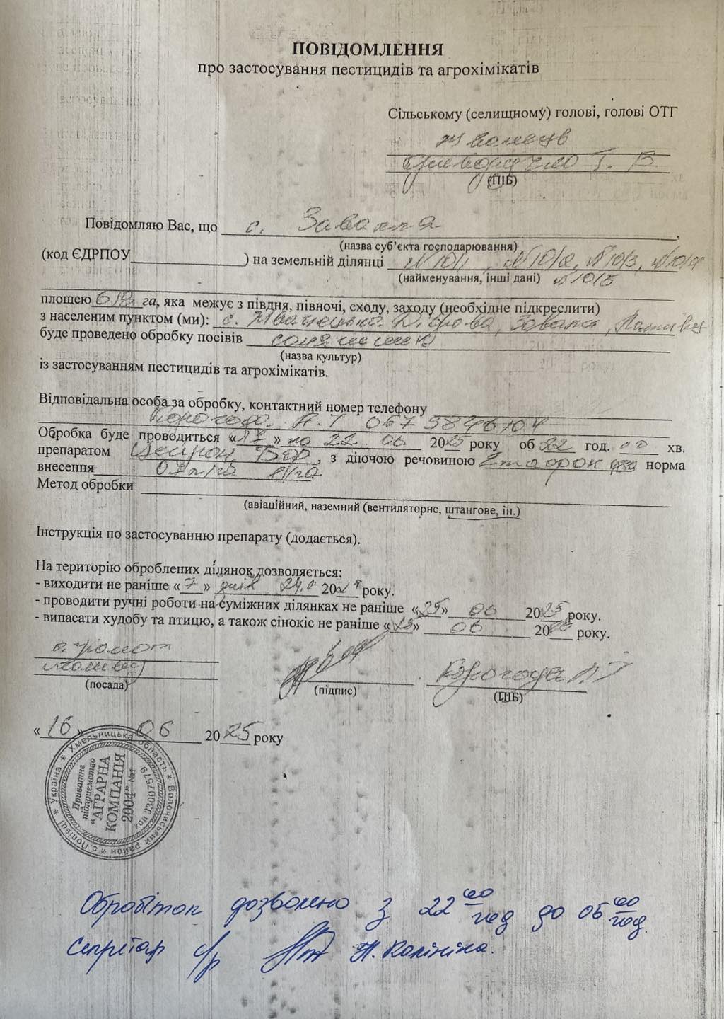 Доводимо до вашого відома, що з 17 по 22 червня 2025 року, в період з 22:00 до 05:00, місцевий суб’єкт підприємницької діяльності планує проводити обробку сільськогосподарських угідь із застосуванням пестицидів та агрохімікатів. Ці заходи спрямовані на захист врожаю та забезпечення його якості.