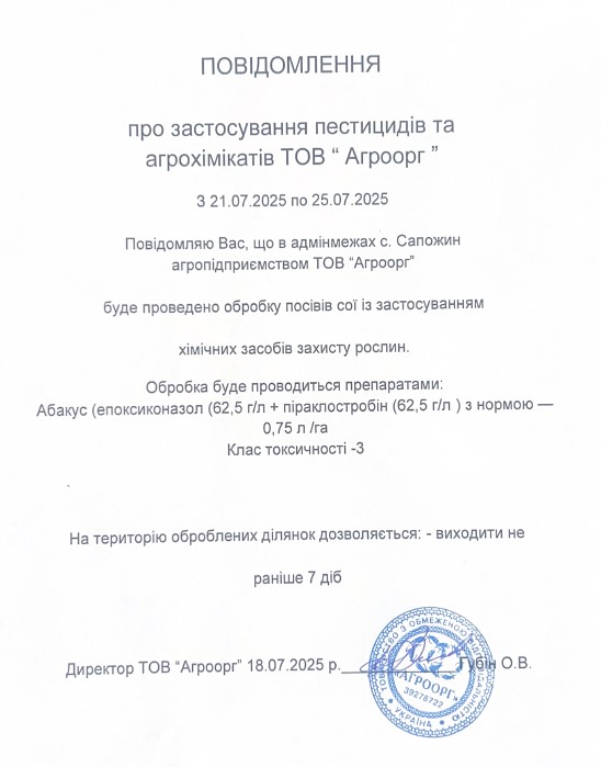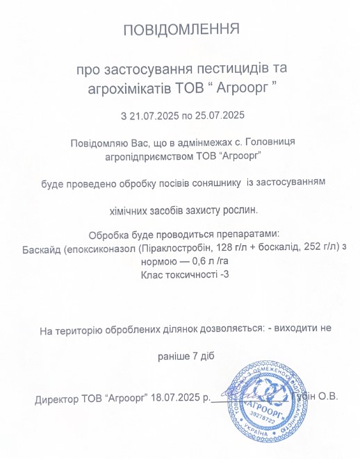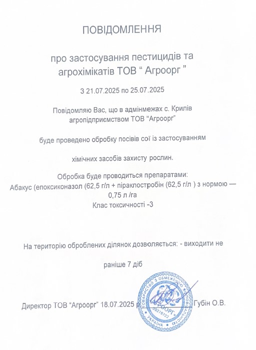 ⚠️ Важливе повідомлення для жителів громади: ТОВ «Акріс Агро Груп» та ТОВ «Агроорг» планують обробку посівів сої із застосуванням засобів захисту рослин (ЗЗР). Ці роботи охоплять території навколо сіл Головниця, Сапожин, Користь та Крилів. Проведення обробки заплановано на період з 21 по 28 липня 2025 року, методом наземного внесення.