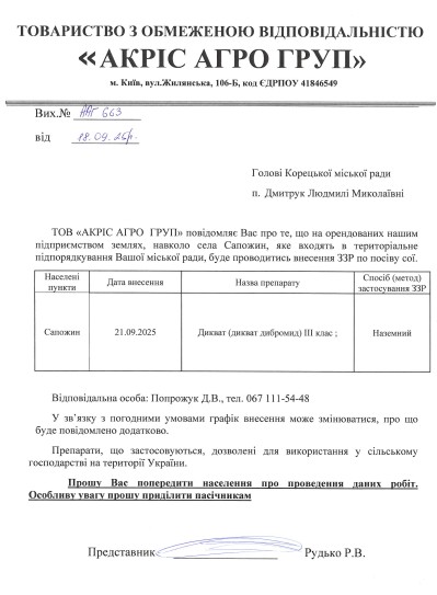 ⚠️ Важливе сповіщення для жителів громади щодо застосування засобів захисту рослин (ЗЗР). ТОВ «Акріс Агро Груп» повідомляє про заплановане внесення препаратів для захисту рослин на посівах сої, які знаходяться поблизу села Сапожин. Ця інформація надається з метою запобігання будь-яким незручностям та забезпечення безпеки всіх мешканців, а також збереження довкілля.