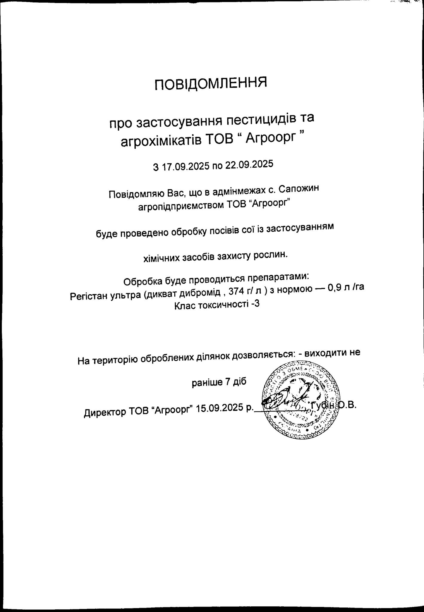 * **Обмеження робіт на сусідніх ділянках:** Якщо ви плануєте проводити сільськогосподарські роботи на ділянках, що межують з обробленими полями, будь ласка, відкладіть їх на зазначений термін. Це допоможе уникнути небажаного контакту з хімікатами.
