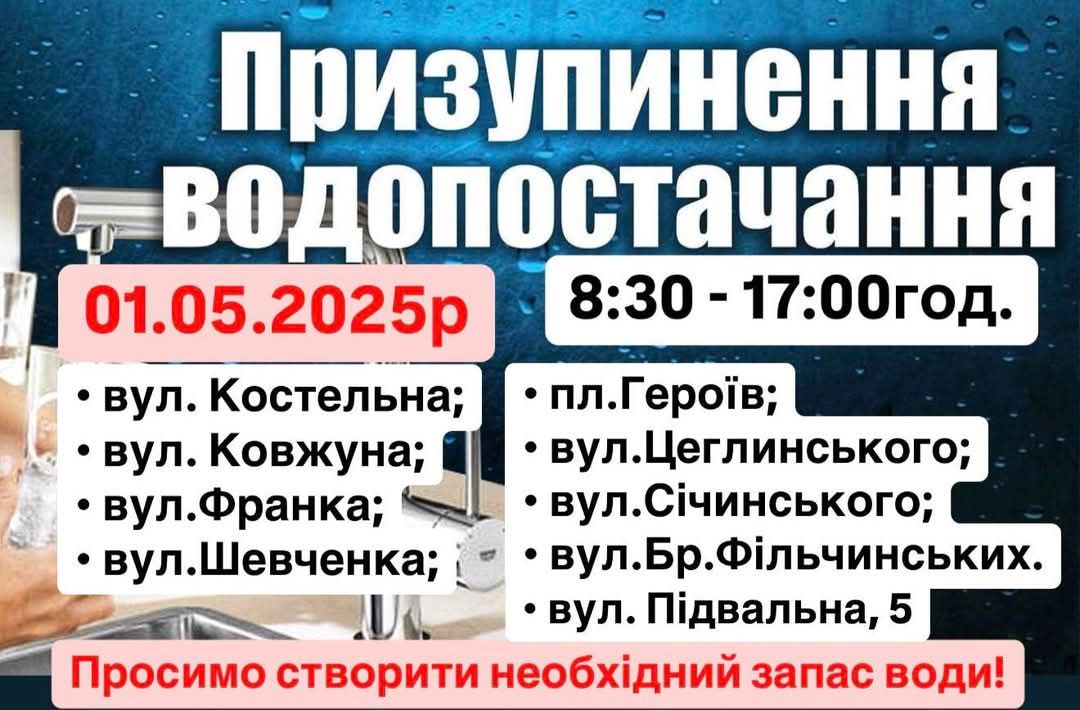 ❗️Увага, за заявкою УК «КомфортДім» тимчасово буде призупинено водопостачання у четвер – 01.05.2025. з 08:30 до 17:00год.