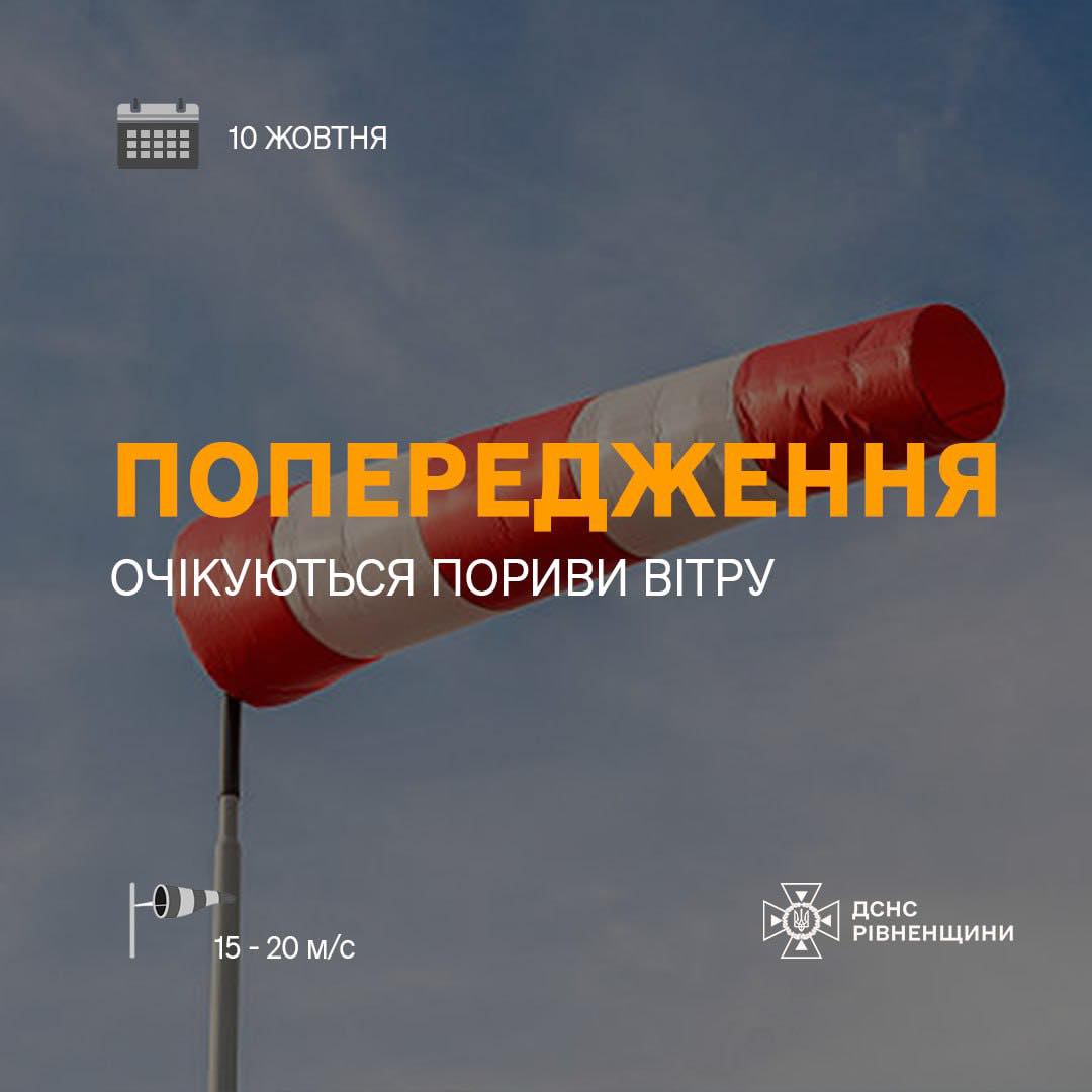 Увага, мешканці Рівненщини! Завтра, 10 жовтня, на території Рівного та області прогнозуються значні погодні незручності. Очікуються пориви північно-західного вітру швидкістю 15–20 м/с. Через це оголошено I рівень небезпечності, що позначається жовтим кольором.