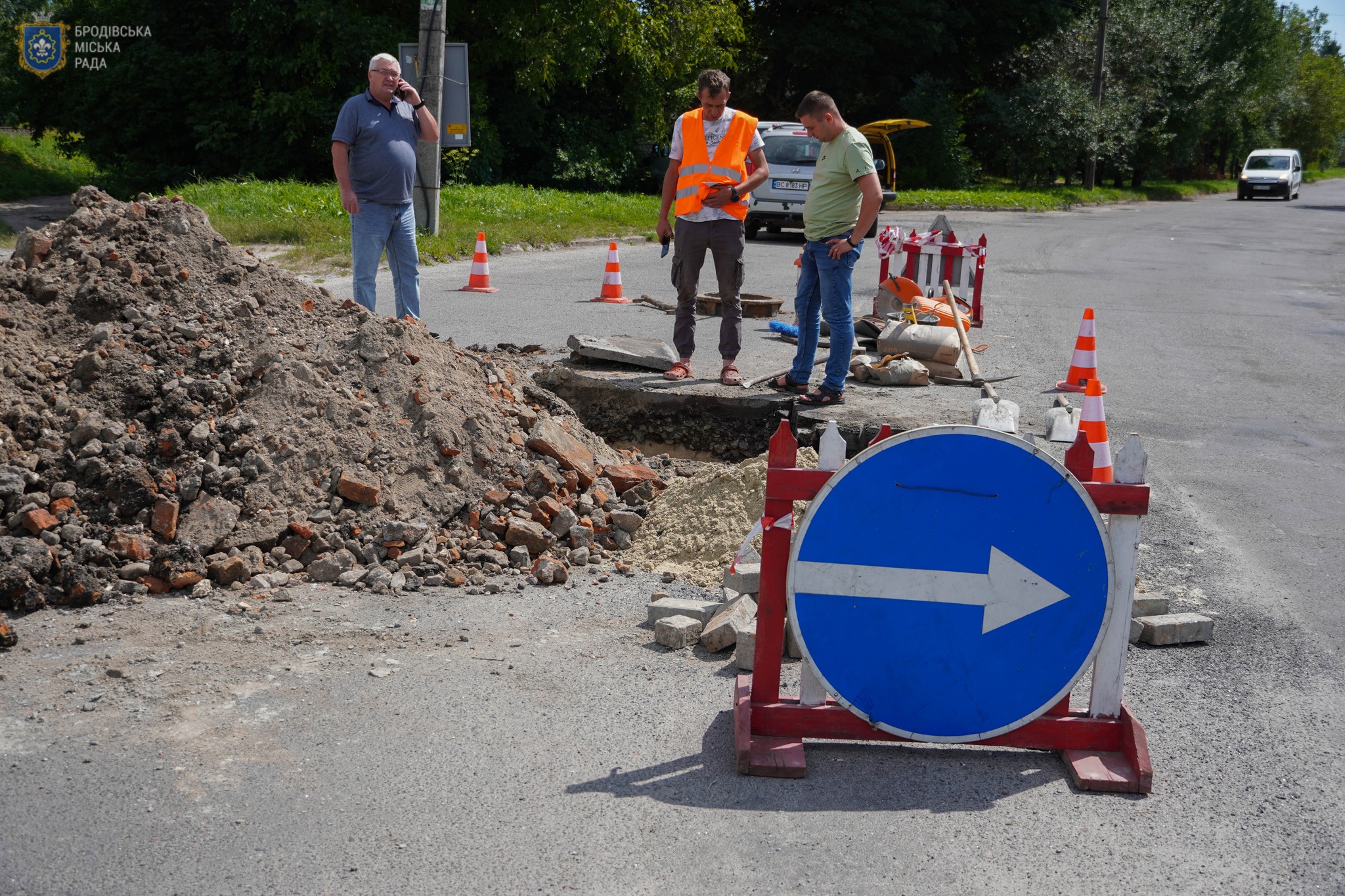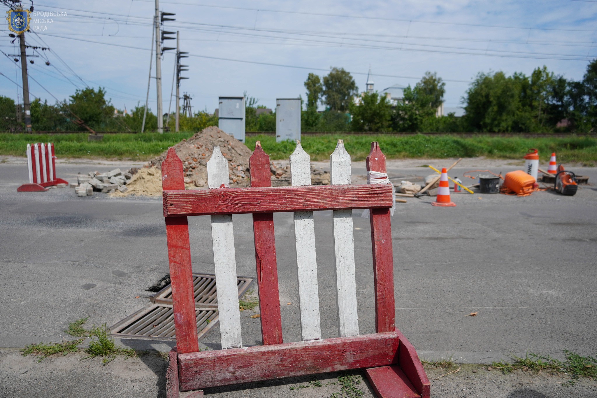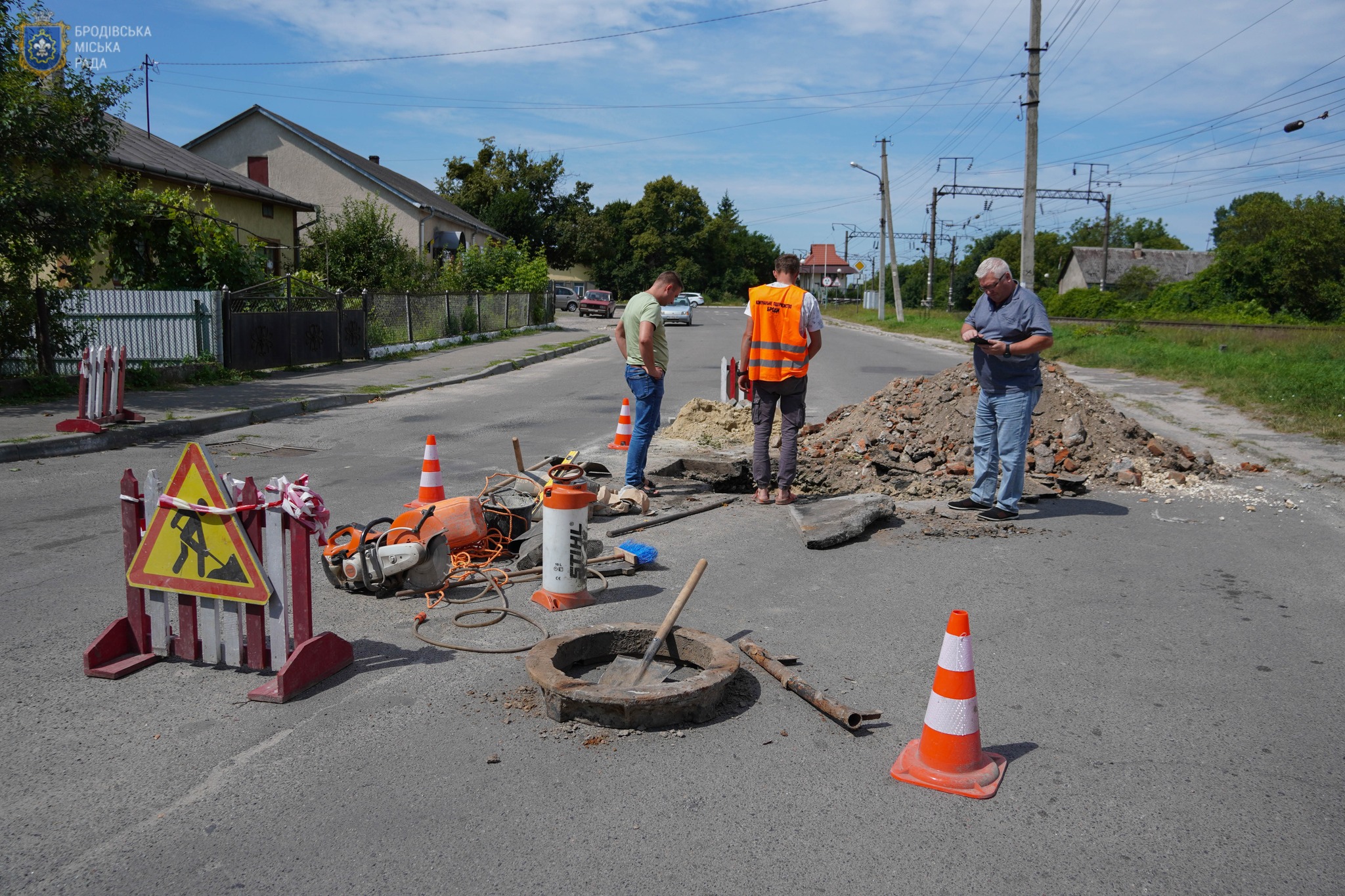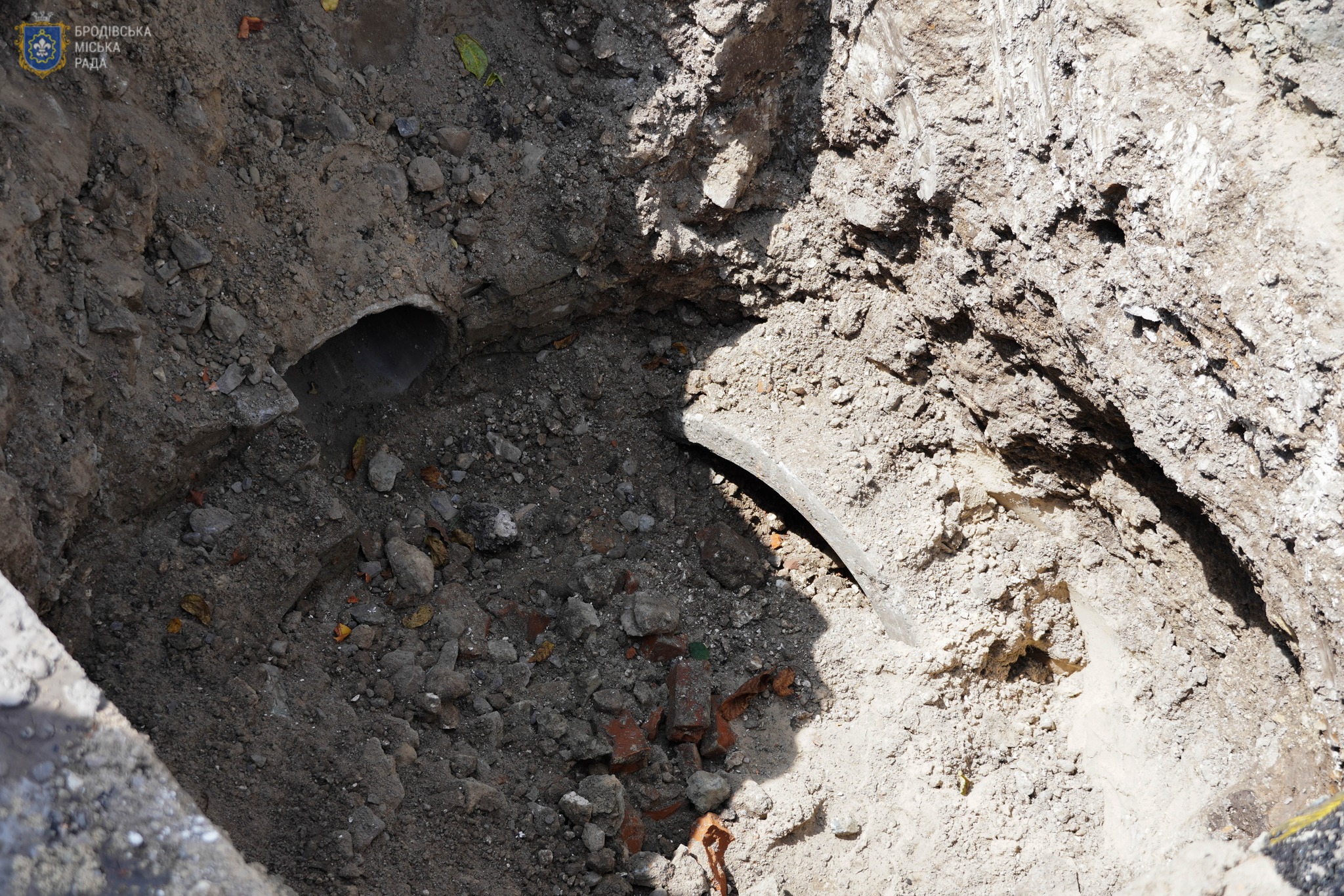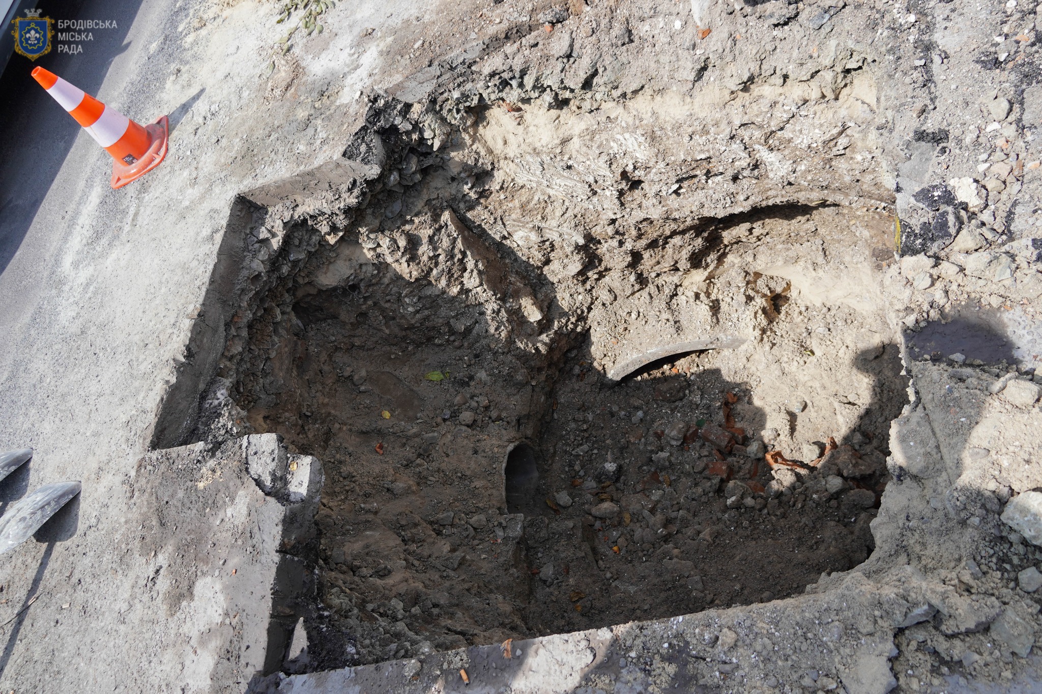 Стрімкий потік дощової води розмив цегляний колодязь ливневої каналізації на вул. Тернопільська. Утворився провал покриття на проїжджій частині. КП «Броди» проводить ремонтні роботи, розкопують місце провалу, щоб відновити мережу ливневої каналізації. Встановлено попереджувальні знаки про обʼїзд та спеціальне огородження, тому проїзд вулицею може бути ускладненим.