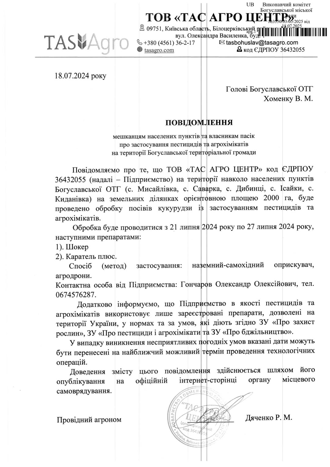 ТОВ «ТАС АГРО ЦЕНТР» інформує про планову обробку посівів кукурудзи на території Богуславської громади. З 21 по 27 липня 2025 року будуть застосовуватися пестициди та агрохімікати на орендованих товариством землях у населених пунктах Мисайлівка, Саварка, Дибинець, Ісайок та Киданівка.
