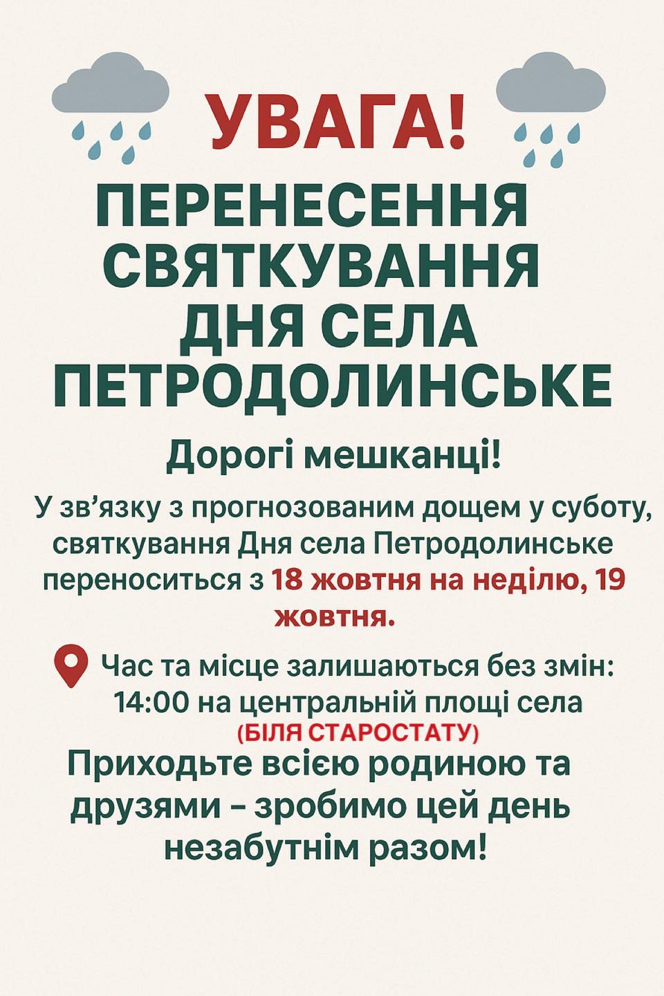 Через несприятливий прогноз погоди, а саме очікуваний дощ у суботу, урочисте святкування Дня села Петродолинське було вирішено перенести. Нова дата проведення свята – неділя, 19 жовтня. Ми щиро сподіваємося, що така зміна не завдасть вам значних незручностей і ви зможете приєднатися до нас наступного дня.