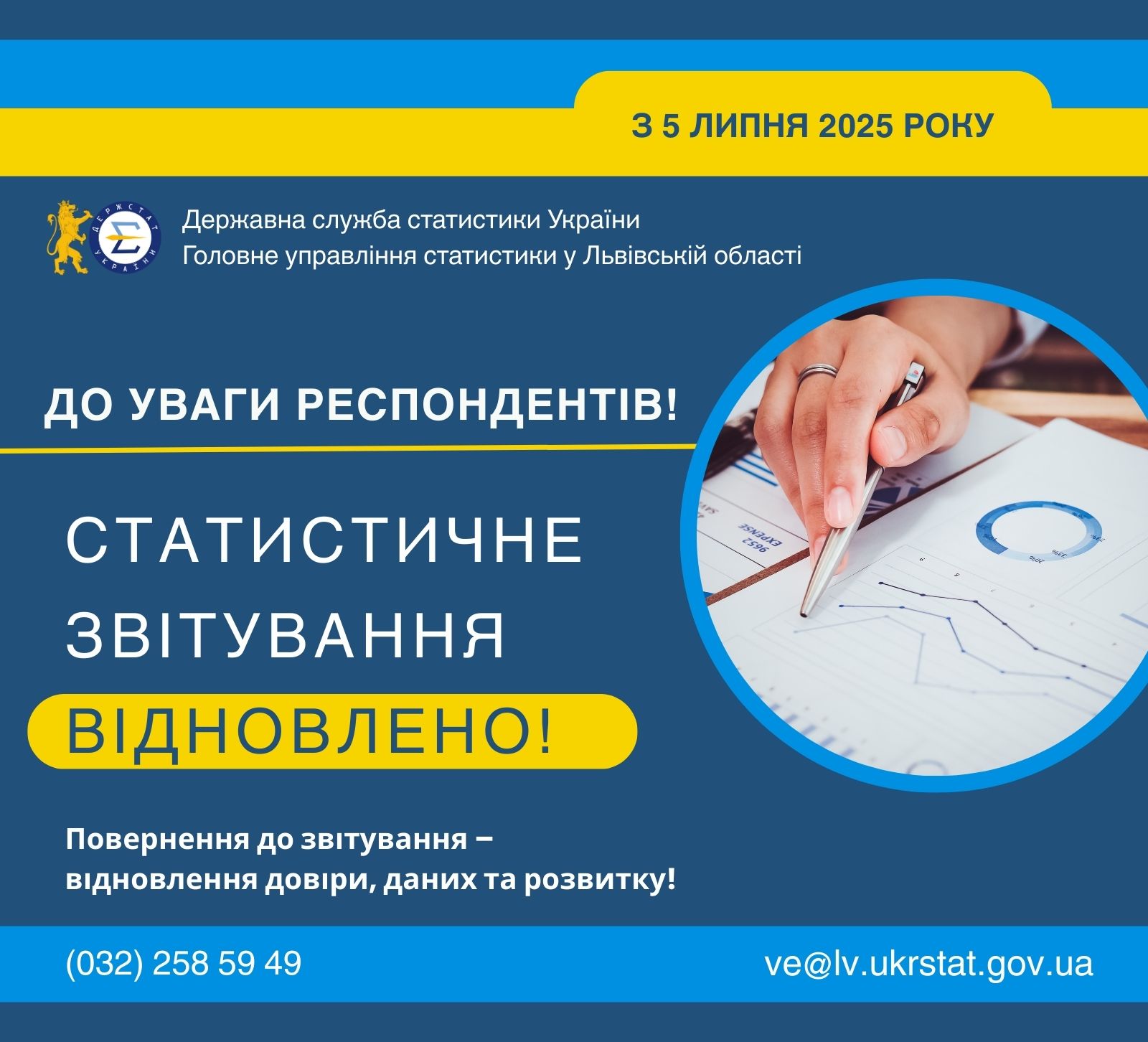 Управління статистики у Львівській області нагадує про відновлення обов’язку подавати державну статистичну та фінансову звітність. Відповідно до змін у законодавстві, які набули чинності з 5 липня 2025 року, усі підприємства, установи та організації, задіяні у державних статистичних спостереженнях, повинні дотримуватися встановлених термінів подання звітності.