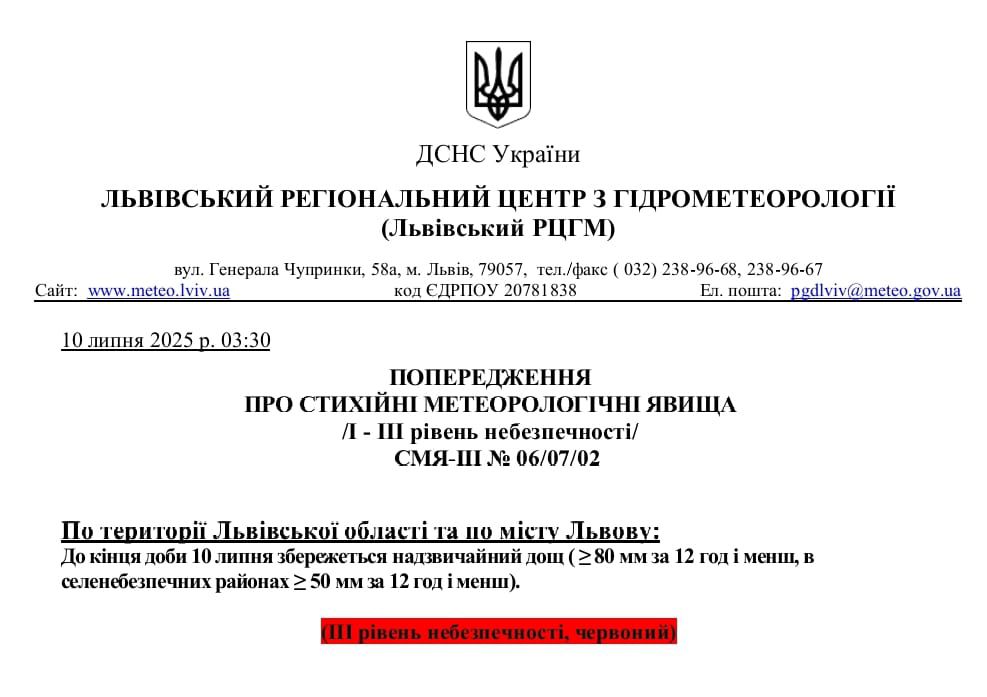 По території Львівської області до кінця доби 10 липня збережеться надзвичайний дощ.