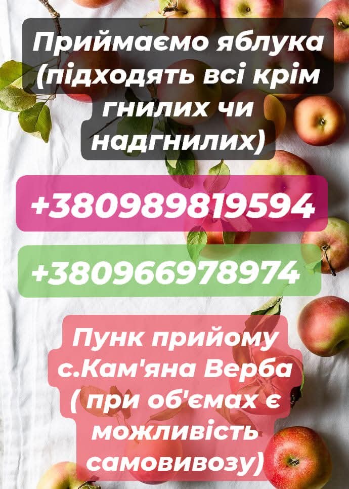 Раді повідомити про початок прийому яблук від населення. Якщо ви маєте надлишок яблук із власного саду, запрошуємо вас приносити їх до нас. Також є можливість виїзду за вашою адресою для забору врожаю. За здані яблука ви гарантовано отримаєте винагороду.🍎💰