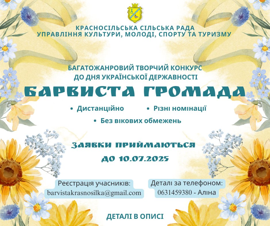 Приєднуйтесь до цього творчого свята, яке об’єднує барвами таланту та непереможної української душі! Покажімо разом, наскільки барвистою, натхненною та патріотичною є Красносільська громада! Нехай цей творчий конкурс стане символом єдності та культурного багатства нашої Батьківщини. 💙