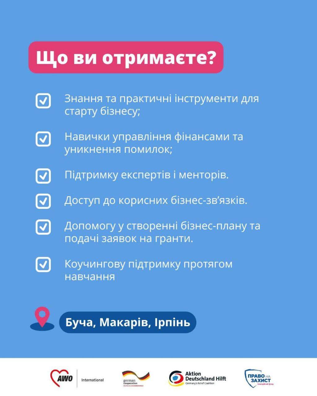 💡 Програма орієнтована на мікропідприємців та людей, які хочуть започаткувати або розвивати власну справу. Учасники отримають практичні знання з бізнес-планування, фінансів, юридичних питань і зможуть сформувати власний бізнес-план, а також дізнатися, як залучати фінансування для розвитку бізнесу.
