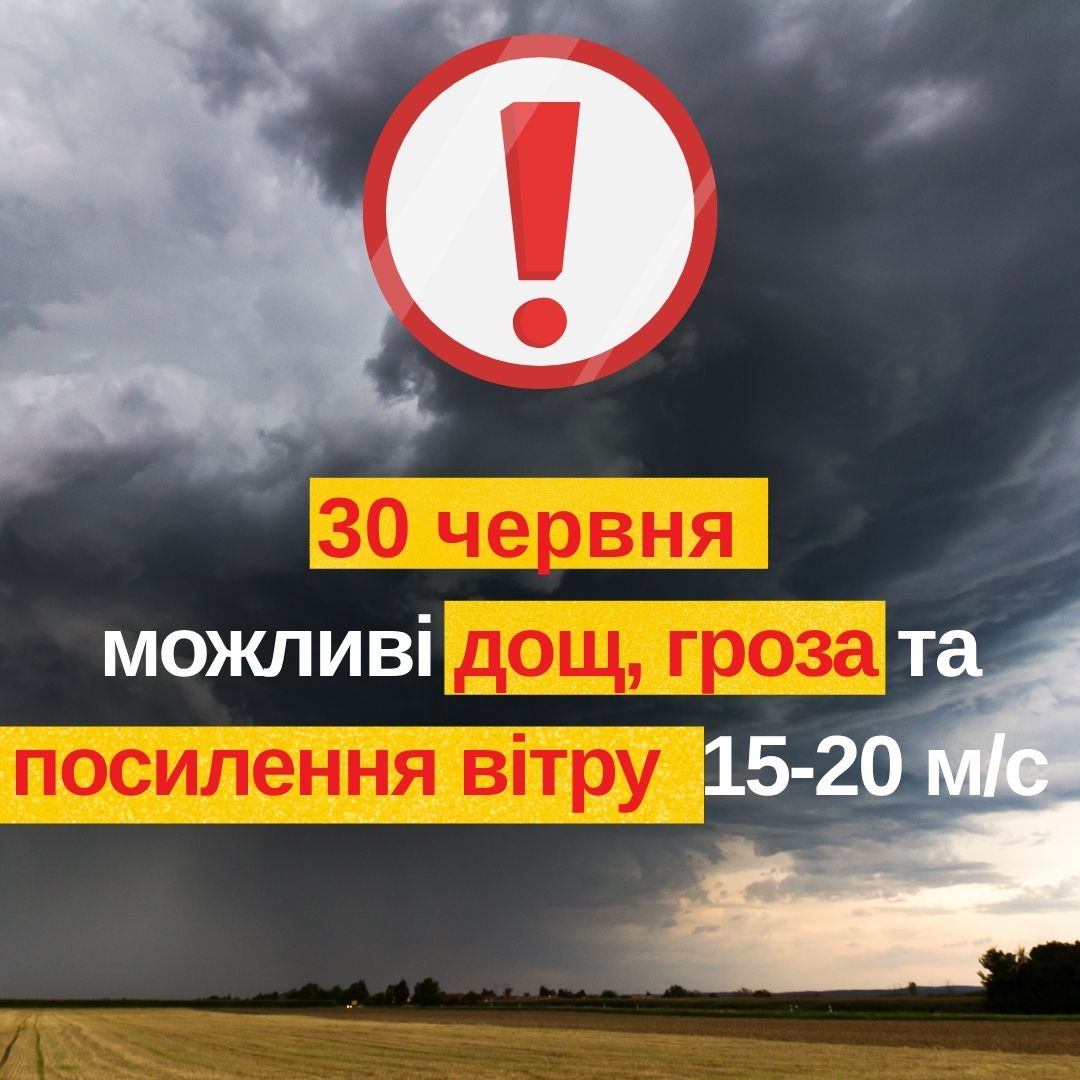 ❗Увага! 🌩️ Сьогодні, 30 червня, по м. Чернігову та області очікуються грози, дощ 🌧️ та посилення вітру до 15-20 м/с. 💨