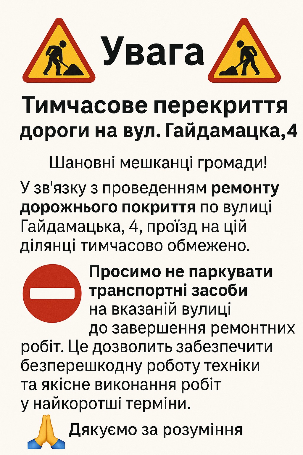 🚧 Увага! Тимчасове перекриття дороги на вул. Гайдамацька, 4 у МостиськахШановні мешканці громади Мостисьок!Повідомляємо про початок важливих робіт з оновлення дорожнього покриття нашого міста. Зокрема, на вулиці Гайдамацька, 4, поблизу магазину господарських товарів, розпочався плановий ремонт дорожнього полотна. У зв’язку з цим, проїзд на даній ділянці тимчасово обмежено. Це необхідний захід для забезпечення безпеки та якості виконання робіт, що є пріоритетом для розвитку інфраструктури нашої громади. Ремонт дороги у Мостиськах, а саме на вулиці Гайдамацькій, має на меті значно покращити стан проїзної частини, усунути наявні дефекти та забезпечити комфортне пересування для всіх.Ці оновлювальні роботи передбачають використання сучасної техніки та матеріалів, що гарантує довговічність та надійність нового покриття. Ми розуміємо, що будь-яке обмеження руху у Мостиськах може викликати певні незручності для водіїв та пішоходів, проте просимо вас поставитися до ситуації з розумінням. Метою цих дорожніх робіт є не тимчасові перешкоди, а створення кращих умов для пересування у довгостроковій перспективі. Кожен етап робіт ретельно контролюється, щоб гарантувати високу якість та ефективність.🛑 Дуже важливо! Для безперешкодного та оперативного виконання всіх етапів ремонту, просимо вас категорично не паркувати транспортні засоби на зазначеній ділянці вулиці Гайдамацька до повного завершення всіх будівельних заходів. Ваша співпраця дозволить будівельним бригадам працювати без затримок, забезпечуючи швидке та якісне оновлення дорожнього полотна. Відсутність припаркованих автомобілів є критично важливою умовою для безпечного та ефективного використання важкої техніки.Ми докладаємо максимум зусиль, щоб завершити ці роботи якнайшвидше і відновити повноцінний рух на вулиці Гайдамацькій. Завершення цього проекту є важливим кроком у програмі з оновлення інфраструктури нашого міста, що позитивно вплине на зручності для мешканців та загальний стан дорожньої мережі. Ці покращення сприятимуть безпечнішому та приємнішому пересуванню вулицями Мостисьок.Будь ласка, заздалегідь плануйте свої поїздки та, по можливості, користуйтеся альтернативними маршрутами, щоб уникнути заторів. Слідкуйте за офіційними оголошеннями щодо термінів завершення робіт та відновлення нормального руху.🙏 Дякуємо вам за проявлене терпіння, розуміння та активну співпрацю у цій важливій справі. Ваша підтримка допомагає нам робити Мостиську кращою, безпечнішою та комфортнішою для життя.