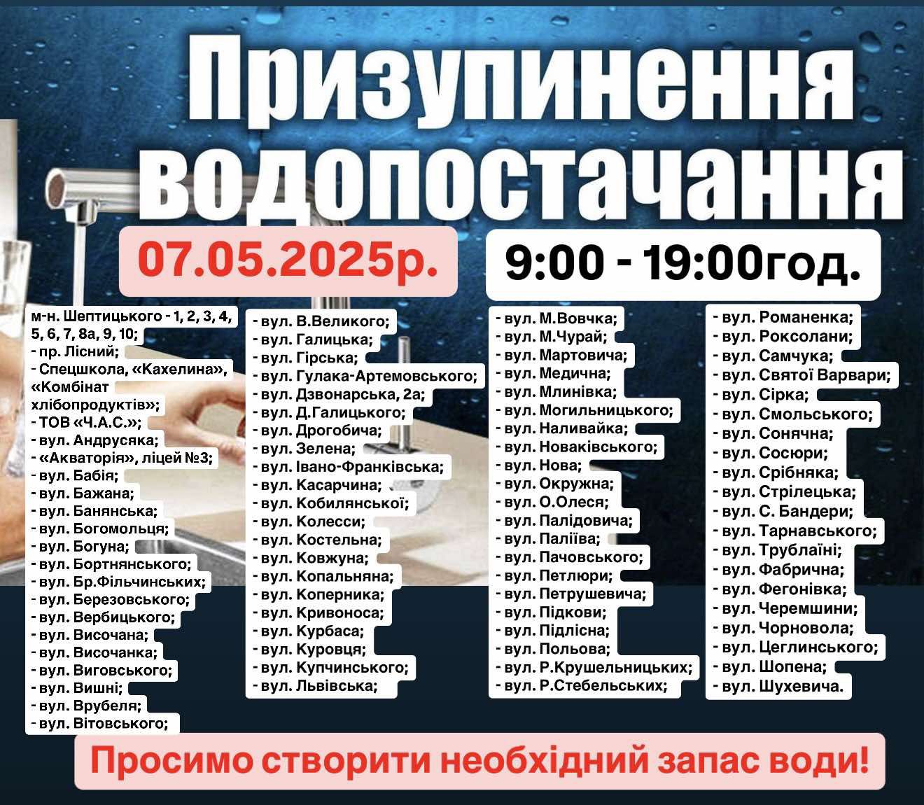 ❗️Увага, мешканці! Тимчасове призупинення водопостачання у середу, 7 травня, з 09:00 до 19:00.