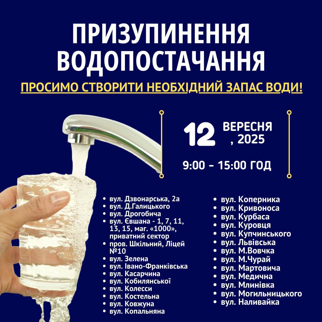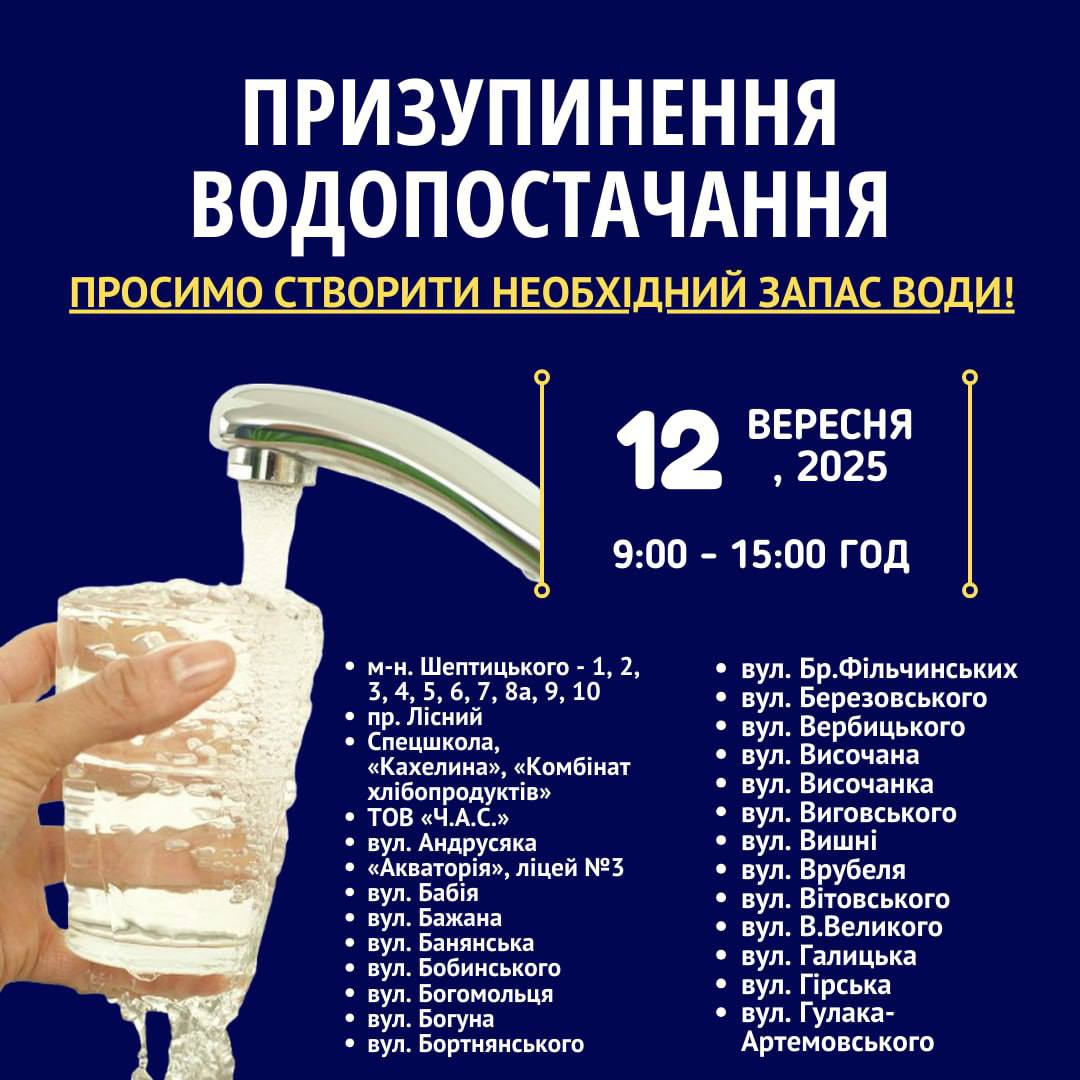 ‼️ Важливе повідомлення для мешканців: тимчасове призупинення водопостачання 12 вересня 2025 року з 9:00 до 15:00.