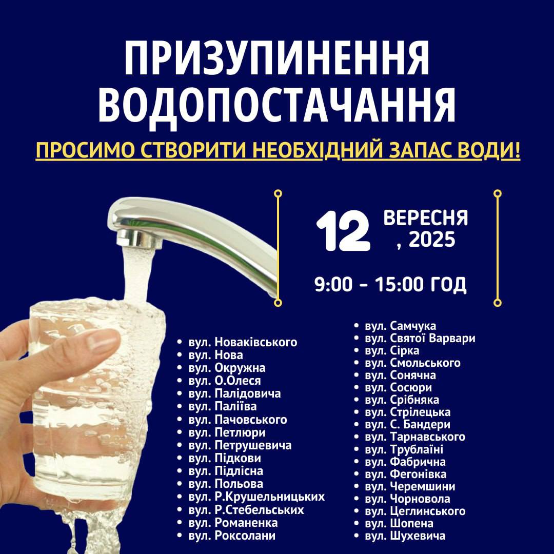 Тимчасове призупинення водопостачання 12.09.2025: список вулиць