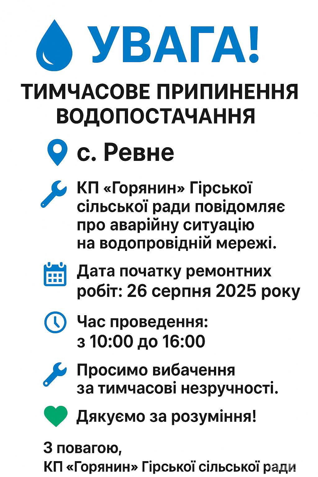 💧 Важливе сповіщення для мешканців с. Ревне: тимчасове припинення водопостачання 💧