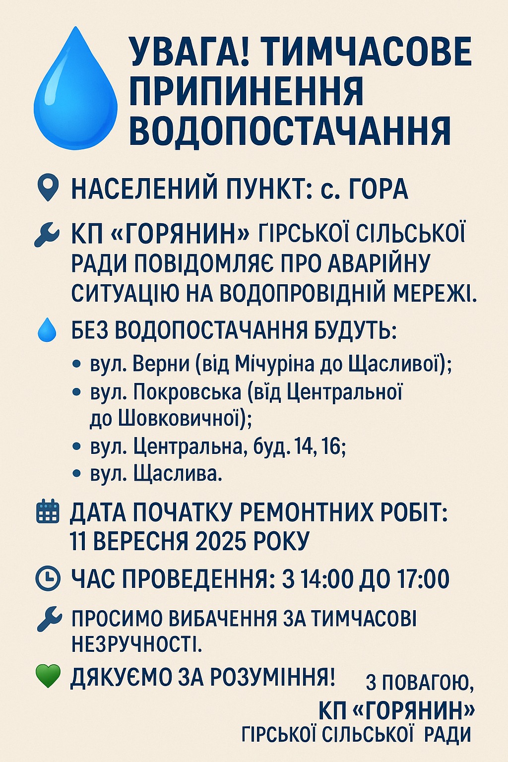 💧 Важливе повідомлення: Тимчасове припинення водопостачання у с. Гора 💧