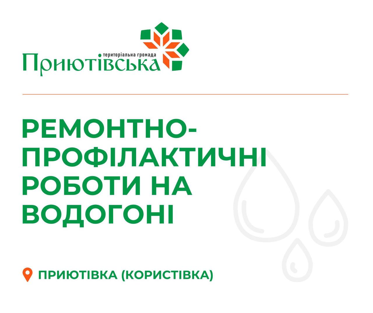 Приютівка, Користівка! КП «Водолій» повідомляє про тимчасове припинення водопостачання у зв’язку з проведенням ремонтно-профілактичних робіт на водонапірній вежі. Сьогодні, починаючи з 14:00, буде припинено подачу води.