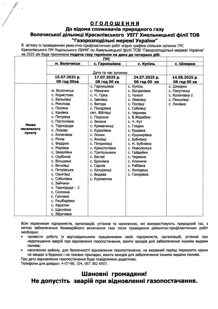 Волочиська дільниця Красилівського УЕГГ Хмельницької філії ТОВ «Газорозподільні мережі України» інформує, що у зв’язку з проведенням ремонтно-профілактичних робіт за графіком спільних зупинок ГРС Красилівського ПМ Подільського ЛВУМГ на 2025 рік, буде тимчасово зупинено роботу газорозподільчих станцій: