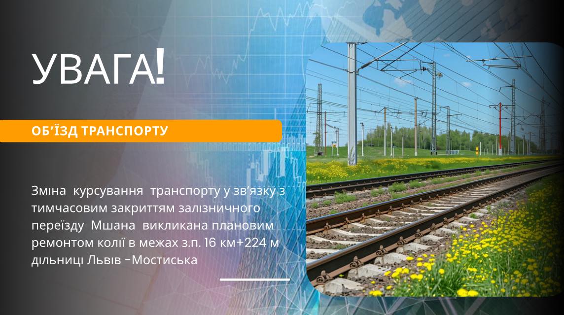 Через проведення невідкладних ремонтних робіт на залізничних коліях, залізничний переїзд у селі Мшана буде тимчасово закритий. Ця необхідна міра дозволить забезпечити безпеку руху та якість інфраструктури.