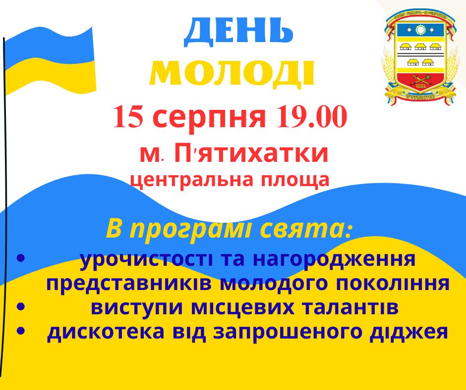 🎉 Запрошуємо всіх мешканців та гостей П’ятихатської громади на святкування Дня молоді! Це чудова нагода відзначити досягнення та таланти нашої молоді, зібратися разом та чудово провести час.
