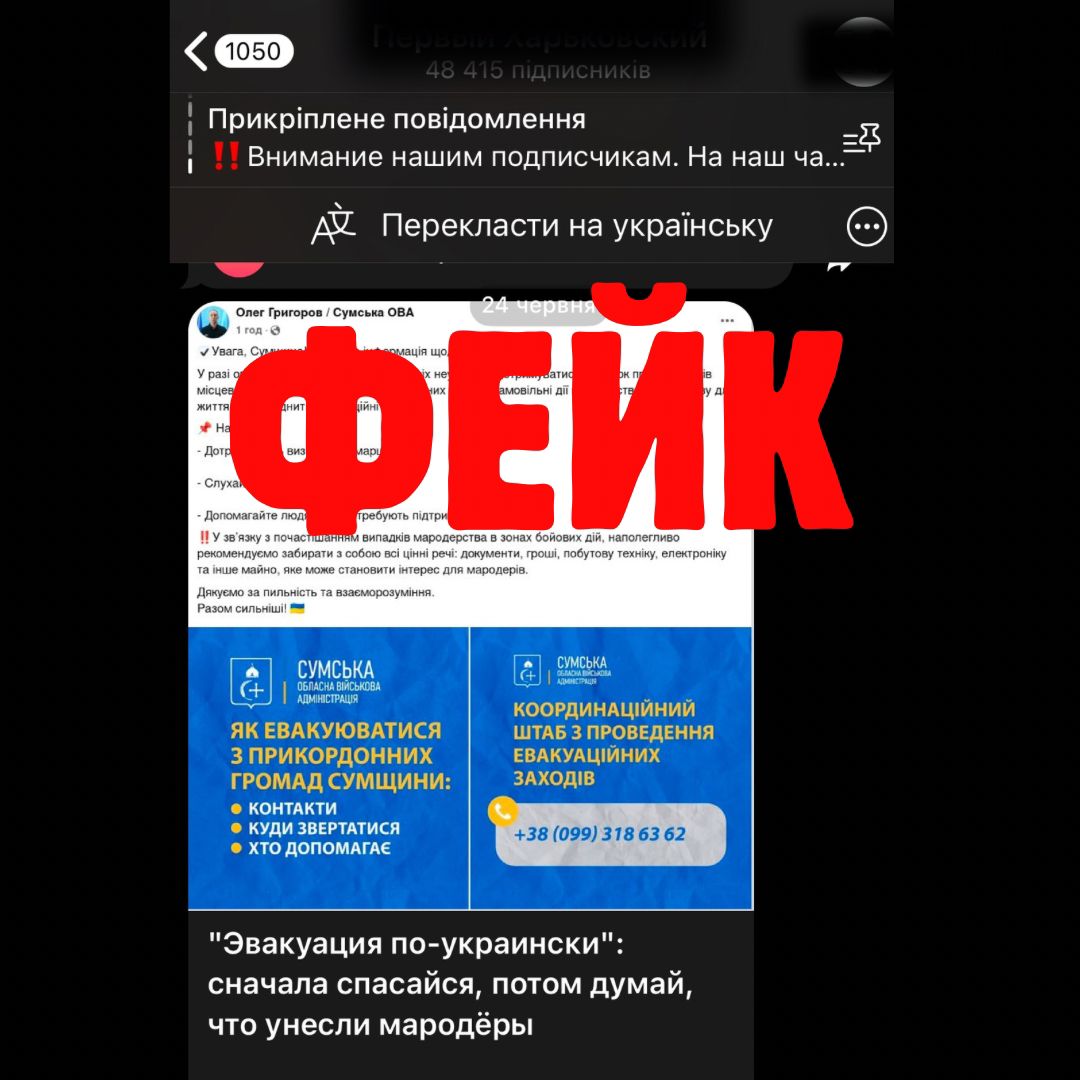 У проросійському телеграм-каналі поширили фейковий скриншот із нібито дописом з офіційної сторінки начальника Сумської ОВА Олега Григорова.