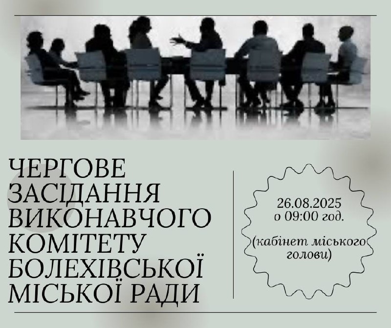 Відповідно до розпорядження міського голови від 25.08.2025 №181-р, чергове засідання виконавчого комітету Болехівської міської ради Івано-Франківської області було перенесено. Нова дата проведення – 26 серпня 2025 року о 09:00 год. Засідання відбудеться у приміщенні міської ради.