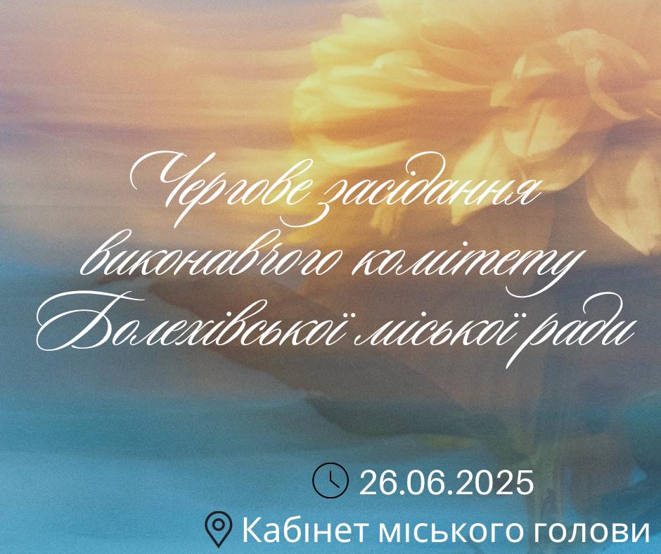 Увага! Запрошуємо на чергове засідання виконавчого комітету Болехівської міської ради, що відбудеться 26 червня 2025 року. Розпорядженням міського голови № 135-р від 18.06.2025 скликано важливе засідання, на якому будуть розглянуті ключові питання розвитку громади. Засідання виконавчого комітету розпочнеться о 14:00 у приміщенні міської ради.