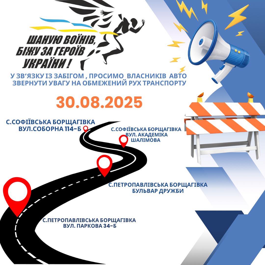 Завтра, 30 серпня 2025 року, у зв’язку з проведенням 8-го Всеукраїнського щорічного забігу «Шаную воїнів, біжу за Героїв України!», буде тимчасово обмежено рух транспорту. Обмеження діятимуть орієнтовно з 9:30 до 10:30.