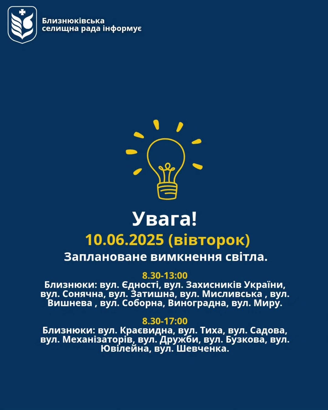 Ключові слова: відключення світла Близнюки, електропостачання Близнюки, планові роботи Близнюки, Близнюки новини, 10.06.2025, графік відключень Близнюки.
