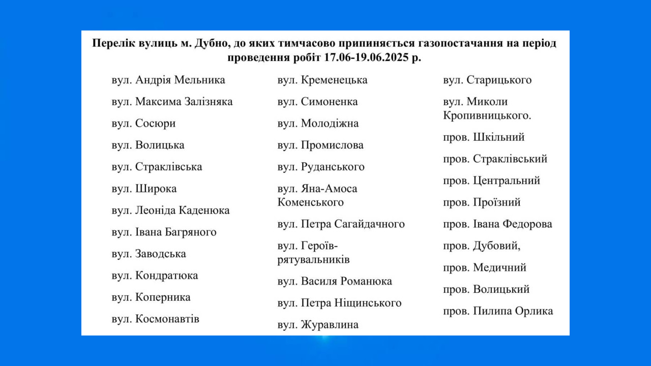 З 8:00 17.06.2025 р. по 17:00 19.06.2025 р. газопостачання буде припинено у м. Дубно, зокрема в районі Цукрового заводу та Страклівський. Це необхідний крок для забезпечення безпечної та надійної роботи газової мережі.