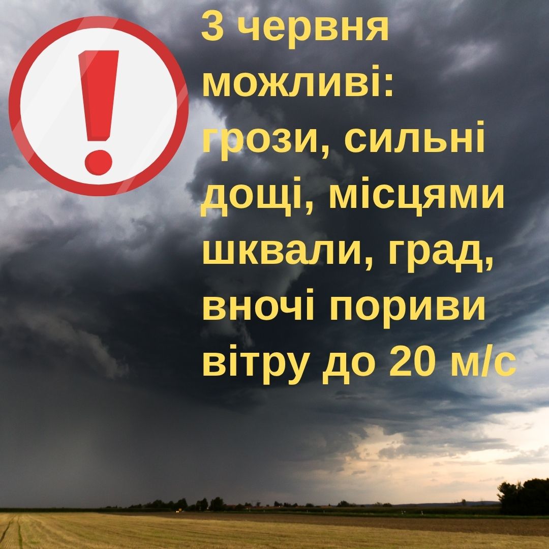 Увага, жителі Чернігова та Чернігівської області! Департамент з питань цивільного захисту Чернігівської ОДА попереджає про погіршення погодних умов. 3 червня вдень очікуються грози, сильні дощі, а місцями – шквали вітру силою 15-20 м/с та град. Будьте обережні!