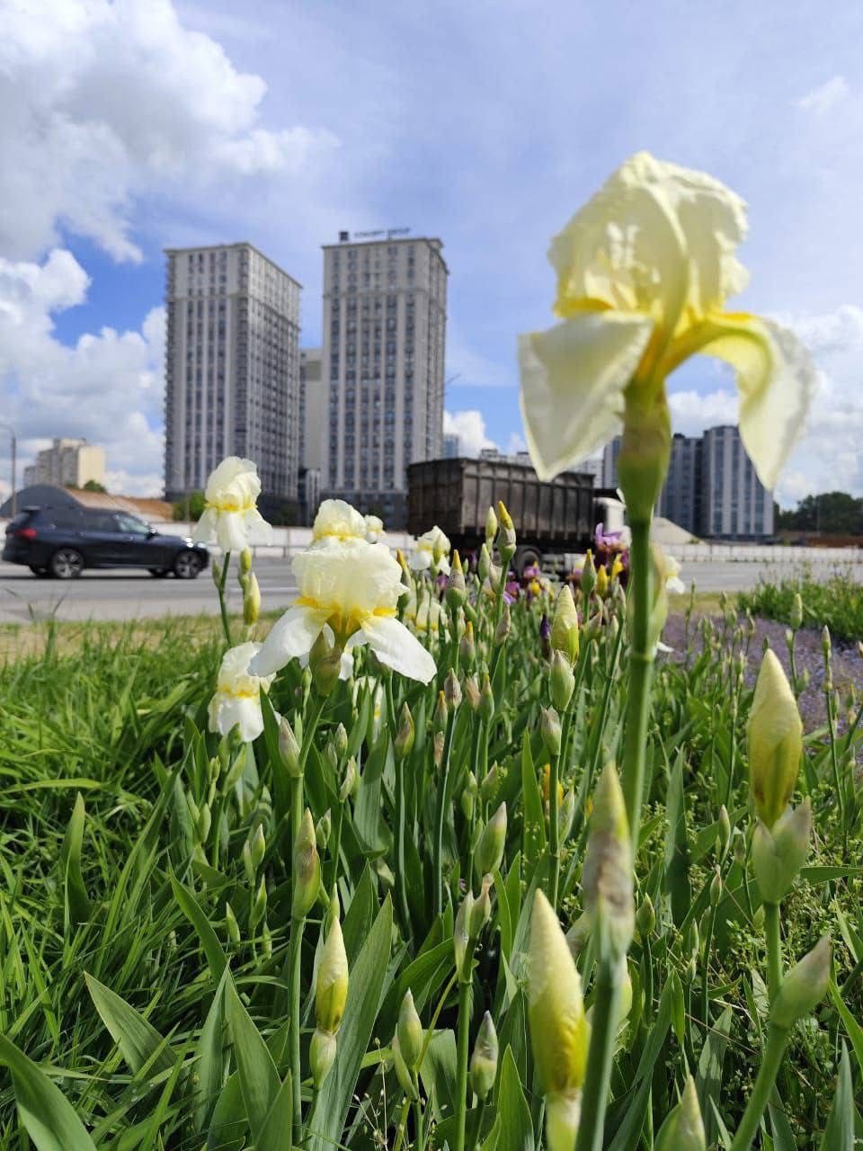 Проспект Миколи Бажана у Києві перетворився на справжню галерею квітів! Уздовж проспекту розквітають іриси, відомі також як півники, даруючи мешканцям та гостям міста неймовірну красу. Ця багаторічна рослина, з її витонченими формами та яскравими кольорами, стала справжньою окрасою міського ландшафту.