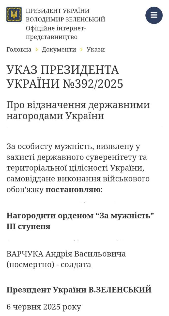 Ми низько схиляємо голови перед подвигом Андрія ВАРЧУКА. Його ім’я навіки буде закарбоване в історії героїчної боротьби українського народу за волю та незалежність України. Він віддав своє життя за те, щоб ми могли жити у вільній країні. Вічна пам’ять та слава Герою Андрію ВАРЧУКУ!