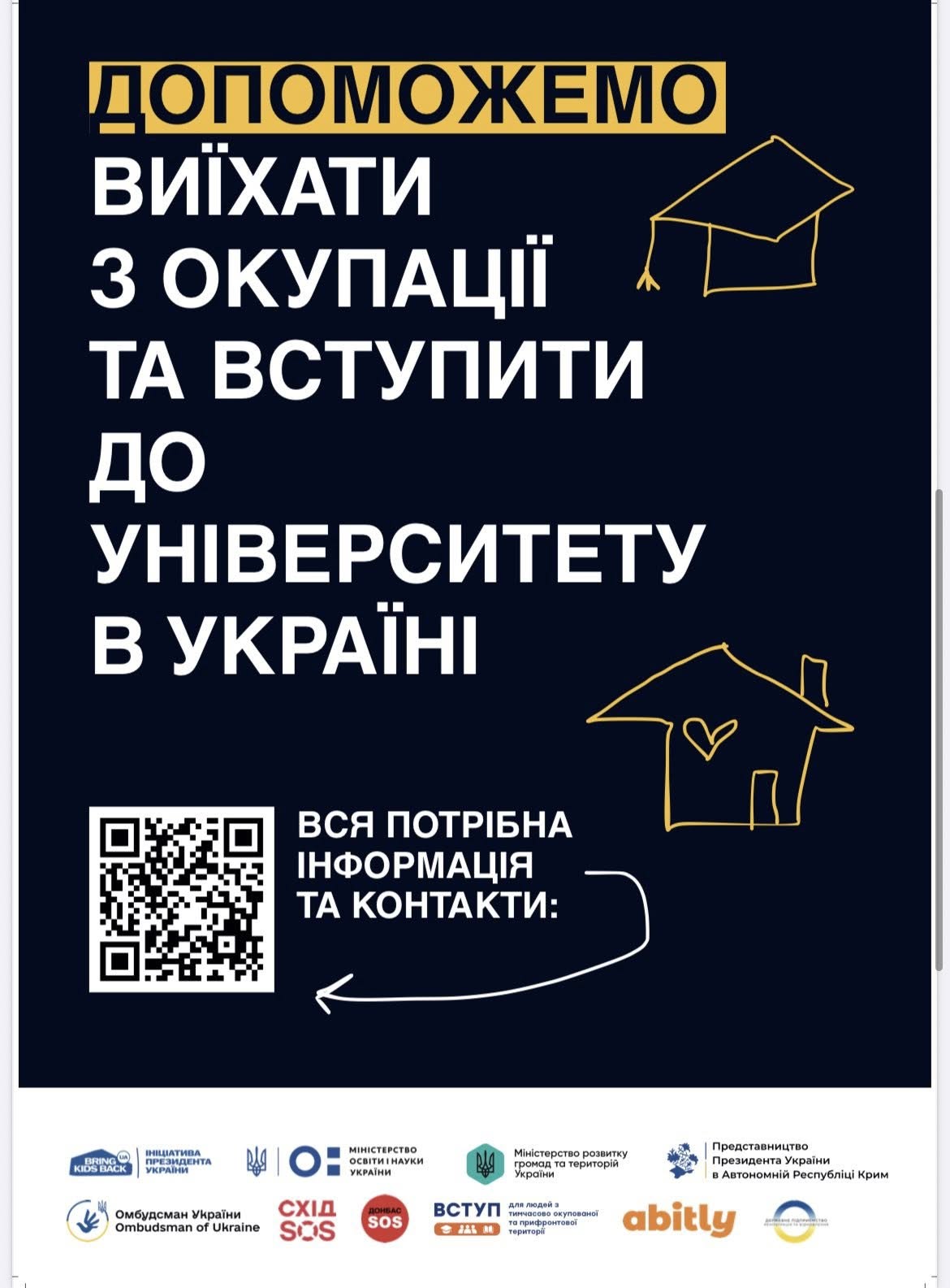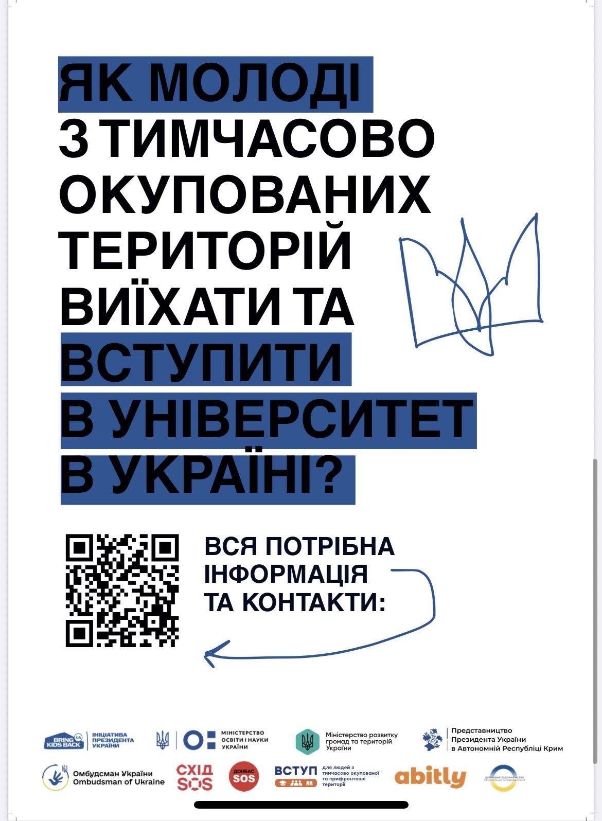 Детальна інформація про можливість безпечно виїхати з ТОТ, умови вступу до закладів вищої освіти в Україні та контакти для звʼязку зібрана за цим посиланням.