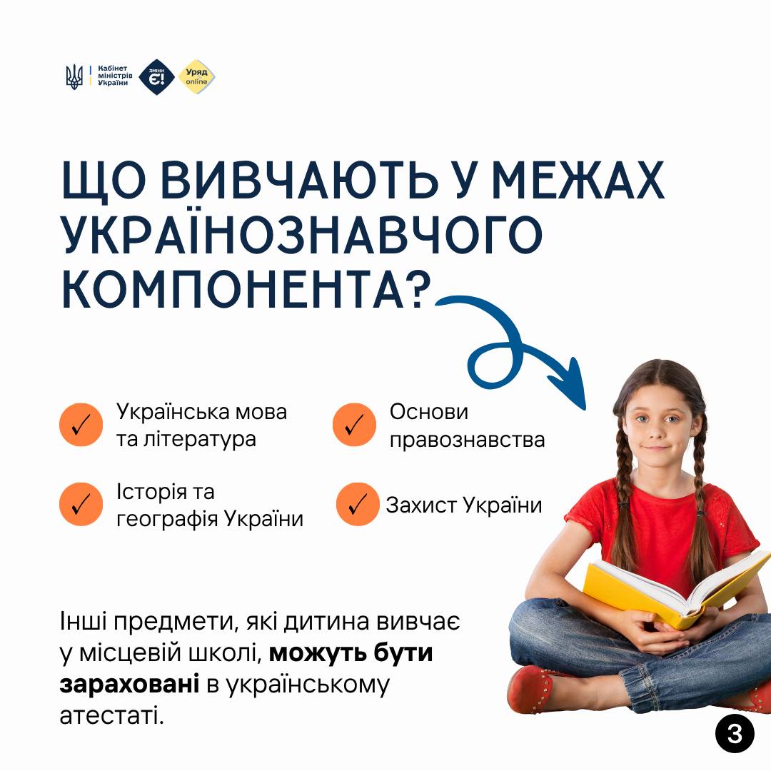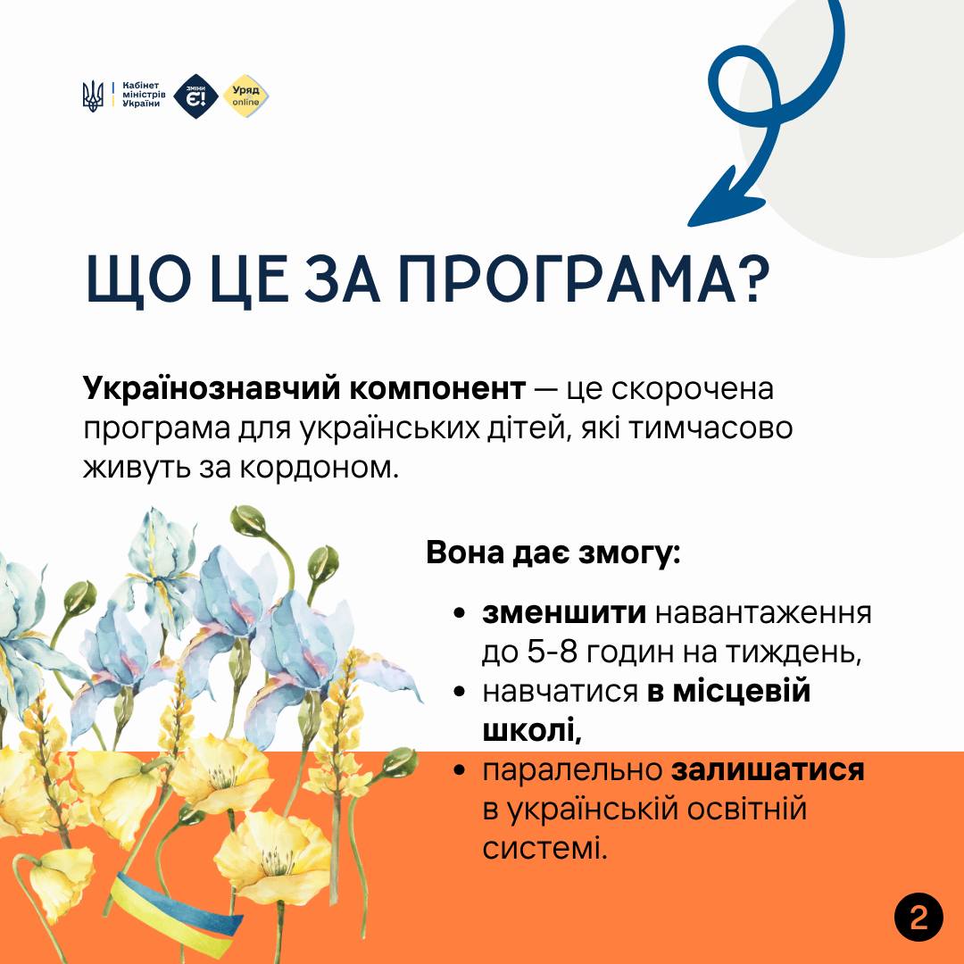 👩🎓 Українознавчий компонент – це скорочена програма для дітей, які тимчасово живуть за кордоном. Вона дає змогу вивчати лише ключові українські предмети 5–8 годин на тиждень.