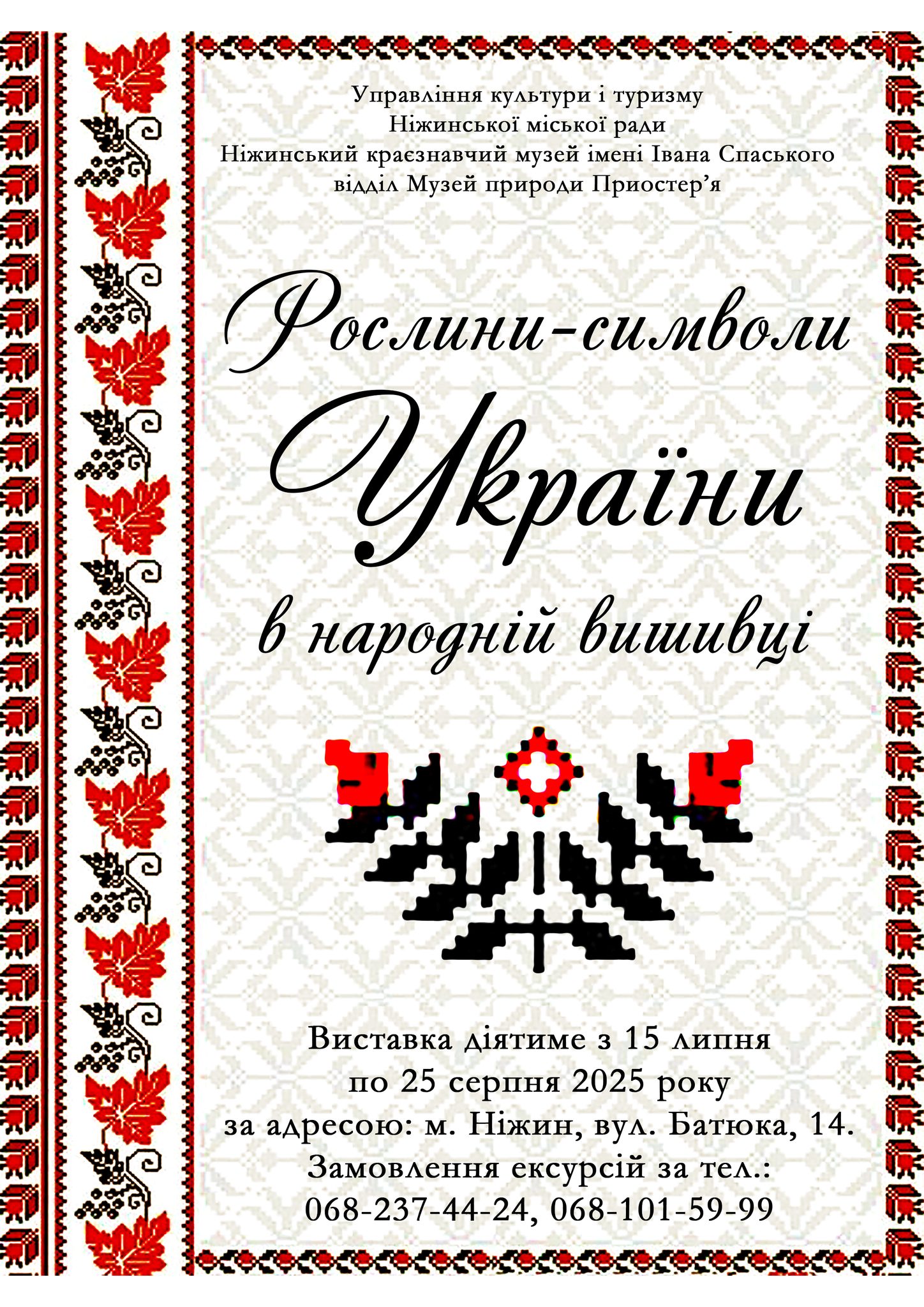 ✔️Запрошуємо всіх охочих відвідати виставку «Рослини – символи України в народній вишивці», де вашій увазі будуть представлені вишиті сорочки і рушники із фондів Ніжинського краєзнавчого музею імені Івана Спаського, а також старовинні і сучасні вишиті вироби з приватних колекцій працівників музею та жителів міста.