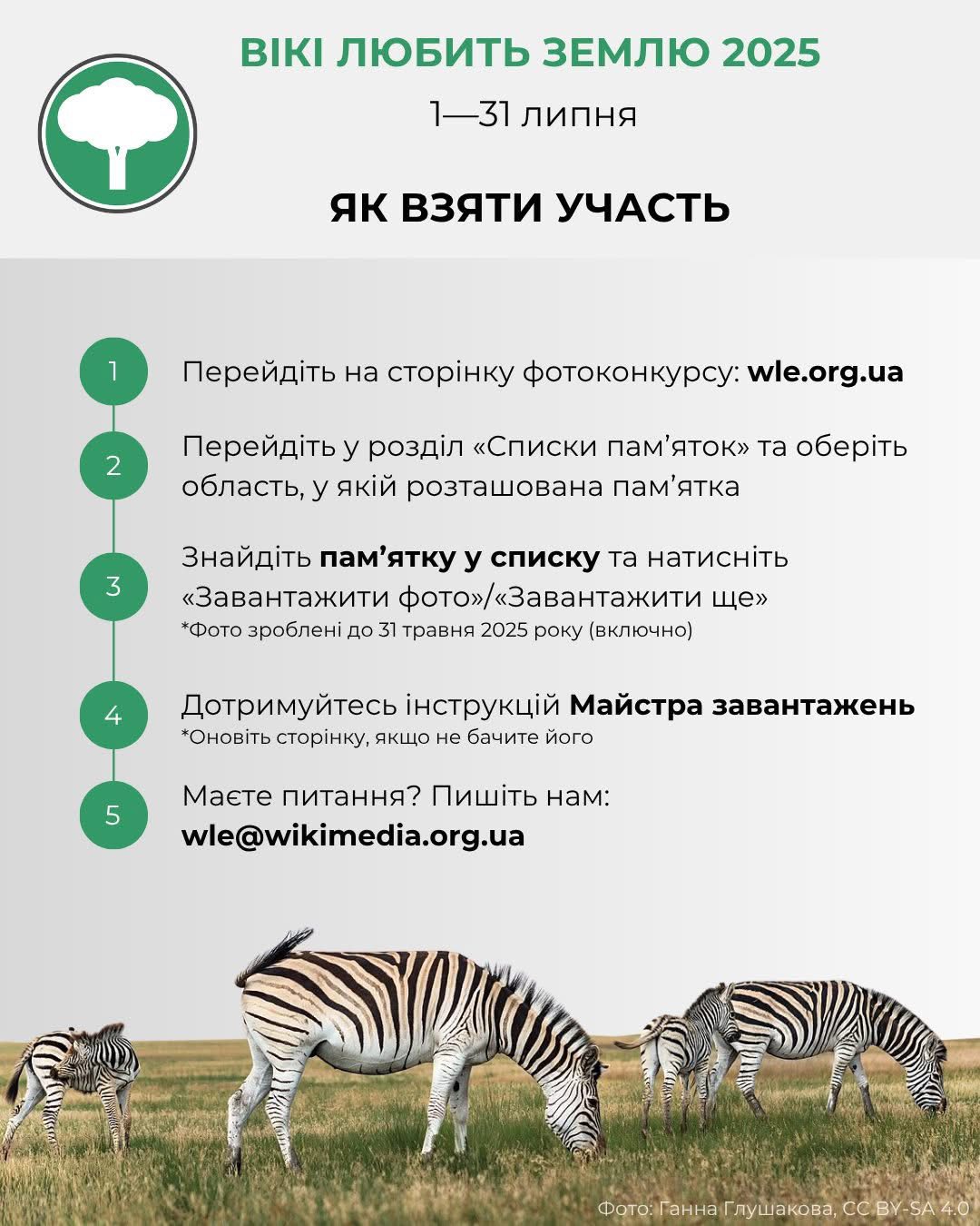 📸 Українська природа у фокусі: триває конкурс «Вікі любить Землю»🌿Громадська організація «Вікімедіа Україна» проводить українську частину міжнародного фотоконкурсу Wiki Loves Earth — «Вікі любить Землю». Ця ініціатива є унікальною можливістю для кожного зафіксувати велич та красу нашої природної спадщини, особливо у складні часи, коли її збереження набуває особливого значення. Конкурс має на меті не просто зібрати естетично привабливі світлини, а й створити цінний візуальний архів для найбільшої онлайн-енциклопедії світу – Вікіпедії.🗓️ Коли? З 1 по 31 липня 2025 року. Це ваш шанс долучитися до масштабного проекту, що сприяє збереженню та популяризації природного багатства України.🎯 Мета: зібрати високоякісні світлини об’єктів природної спадщини України для ілюстрації статей у Вікіпедії. Кожен знімок – це не лише кадр краси, а й внесок у спільну справу збереження пам’яті про унікальні куточки нашої країни. У період випробувань, які переживає Україна, фіксація природних об’єктів стає ще важливішим кроком для документування та майбутнього відновлення. Через фотографії ми можемо показати світу та майбутнім поколінням неповторність української природи.📌 Що можна подавати?✅ Фото, зроблені до 31 травня 2025 року. Це дозволяє учасникам використовувати як нові, так і вже існуючі в їхніх архівах роботи, що відповідають вимогам конкурсу «Вікі любить Землю».✅ Знімки з дронів чи інших літальних апаратів — до 23 лютого 2022 року. Ця умова є важливою для забезпечення безпеки та дотримання чинного законодавства. Це також дає можливість показати природу України з незвичайних ракурсів.Що важливо знати про конкурс «Вікі любить Землю»?🔹 У конкурсі представлено близько 9000 природних об’єктів України, що підлягають фотографуванню. Це величезна база для вибору локацій та об’єктів для ваших світлин. Від величних гірських хребтів до тихих річкових заплав, від заповідників до ботанічних садів – кожен може знайти щось до душі.🔹 Передбачено 2 основні номінації – «кількісна» та «якісна». «Кількісна» номінація заохочує учасників до завантаження якомога більшої кількості унікальних фотографій різних об’єктів, тоді як «якісна» фокусується на художній цінності та технічній досконалості окремих знімків, що показують красу природи.🔹 Спеціальні номінації – «Відео» та «Втрати природи» (реалізується у співпраці з громадською організацією «Екодія»). Номінація «Втрати природи» є особливо актуальною, дозволяючи задокументувати збитки, нанесені довкіллю, та підвищити обізнаність про екологічні наслідки.🔹 15 найкращих робіт, що переможуть на національному етапі, представлять Україну на міжнародному рівні, змагаючись з фотографіями з усього світу. Це чудова можливість показати світлини природи України міжнародній спільноті.🏆 На переможців чекають цінні призи, які стануть гідною відзнакою їхнього таланту та внеску. Проте, не менш важливим є сам факт участі, адже це вже значний внесок у збереження нашої природи та її цифрову паспортизацію. Кожен знімок допомагає збагатити знання про українську спадщину та зробити її доступною для мільйонів користувачів Вікіпедії.📣 Організатори конкурсу «Вікі любить Землю» щиро запрошують до співпраці краєзнавців, професійних та аматорських фотографів, а також усіх небайдужих громадян. Ви можете долучит