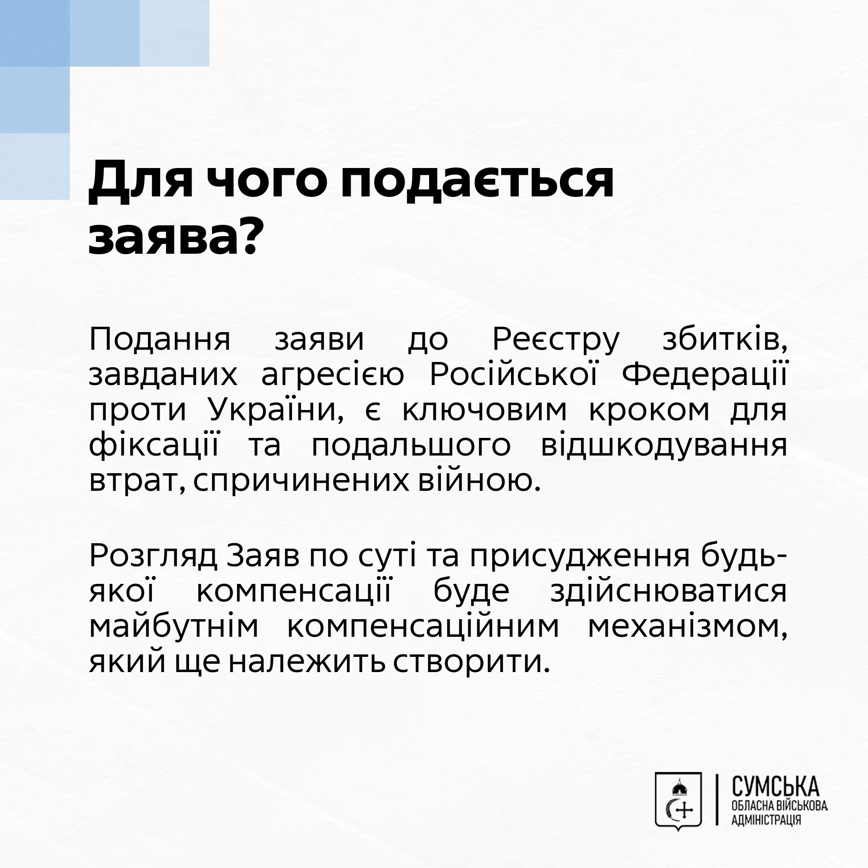 Закликаємо всіх, хто постраждав від дій агресора, не зволікати та повідомляти про завдані збитки до міжнародного Реєстру. Чим більше заяв буде подано, тим швидше буде запущено ефективний компенсаційний механізм, що наблизить нас до справедливого відшкодування завданої шкоди. Ваша активна участь є важливим внеском у процес відновлення України та притягнення агресора до відповідальності за його злочини.