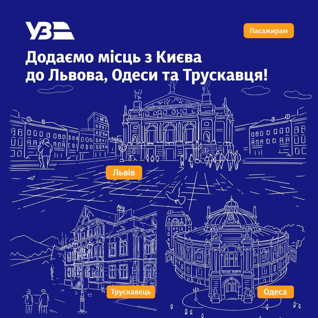 - 🚂 Поїзд № 159/160 Київ — Трускавець: Для тих, хто шукає оздоровлення та релакс у відомому бальнеологічному курорті, додаткові поїзди Укрзалізниці до Трускавця вирушатимуть з Києва та Трускавця: 29, 30 червня, а також 1, 2, 6, 7, 8, 9, 13, 14, 15, 16, 20, 21, 22, 23, 27, 28, 29, 30 липня.