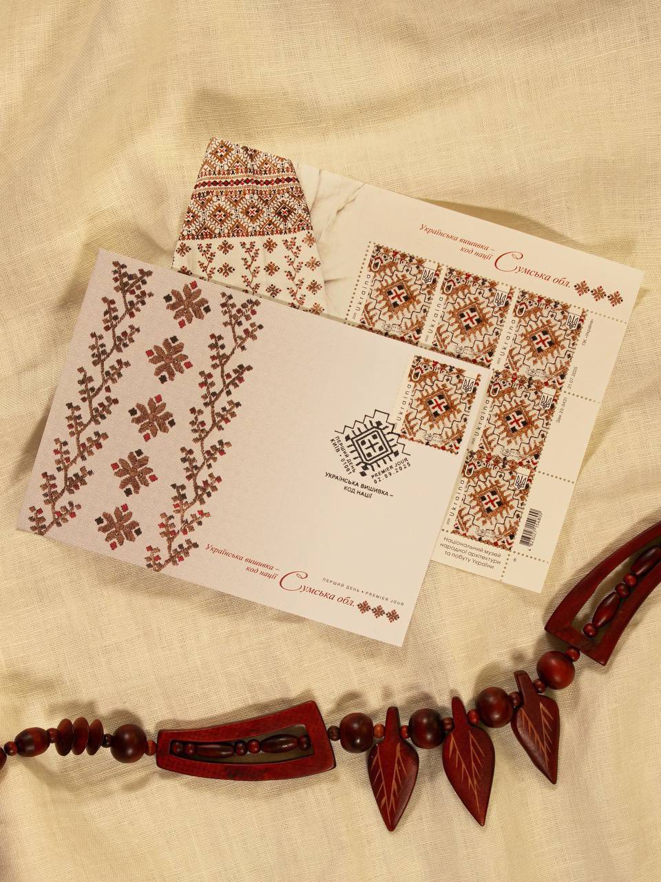 Друга марка серії представляє Сумщину, на ній зображено жіночу сорочку, виготовлену з домотканого полотна. Особливу увагу приділено рукавам, прикрашеним виразними ромбами та витонченими квітковими гірляндами. Це свідчення високого рівня майстерності та естетичного смаку народних майстринь регіону.