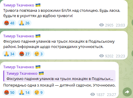 За інформацією Ткаченка, уламки ворожих дронів були зафіксовані на трьох різних локаціях у Подільському районі Києва. Це викликало серйозне занепокоєння, адже попередньо встановлено, що одна з точок падіння уламків припала на територію дитячого садка. Точна інформація щодо можливих постраждалих або обсягів руйнувань наразі уточнюється відповідними службами. Голова КМВА також додав, що наразі з’ясовуються обставини щодо інших можливих постраждалих та руйнувань інфраструктури.