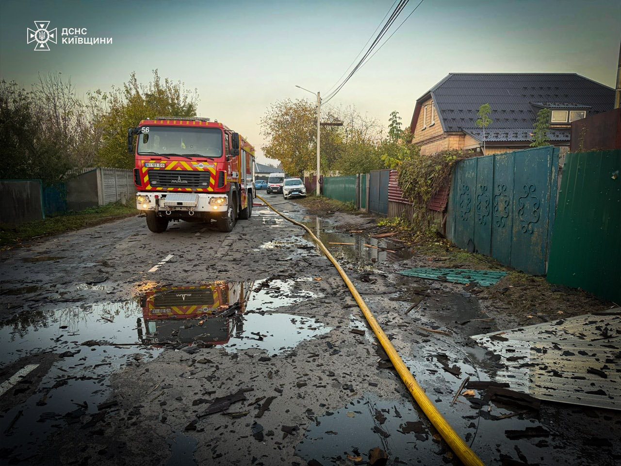 У селі Погреби наслідки ворожих ударів торкнулися вантажного автомобіля, причепа та фасаду автозаправної станції. Місто Українка в Обухівському районі також зазнало втрат: поранення отримав працівник АЗС 1976 року народження. Його з діагнозом «забійна рана голови» госпіталізовано до місцевої лікарні.