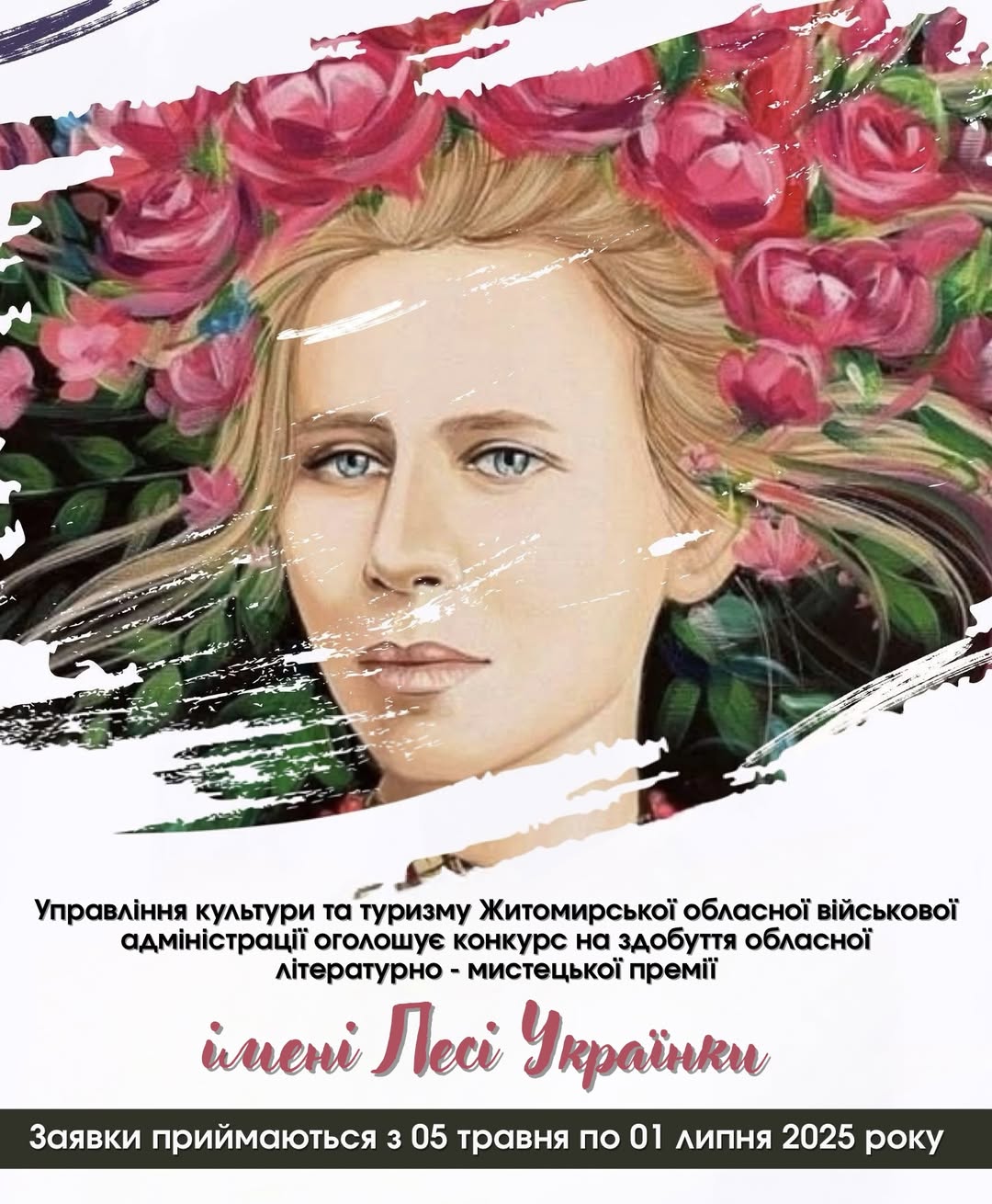 Управління культури та туризму Житомирської обласної військової адміністрації оголошує конкурс на здобуття обласної літературно – мистецької премії імені Лесі Українки. Це чудова нагода для митців Житомирщини продемонструвати свій талант та здобути визнання у сфері культури.