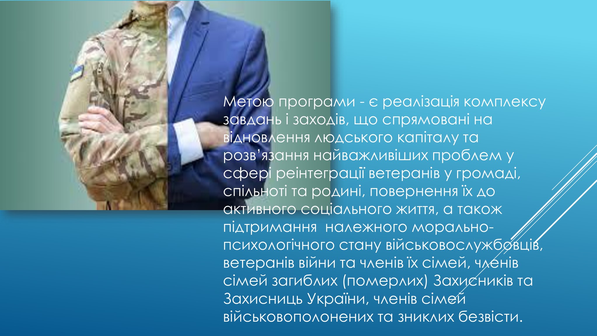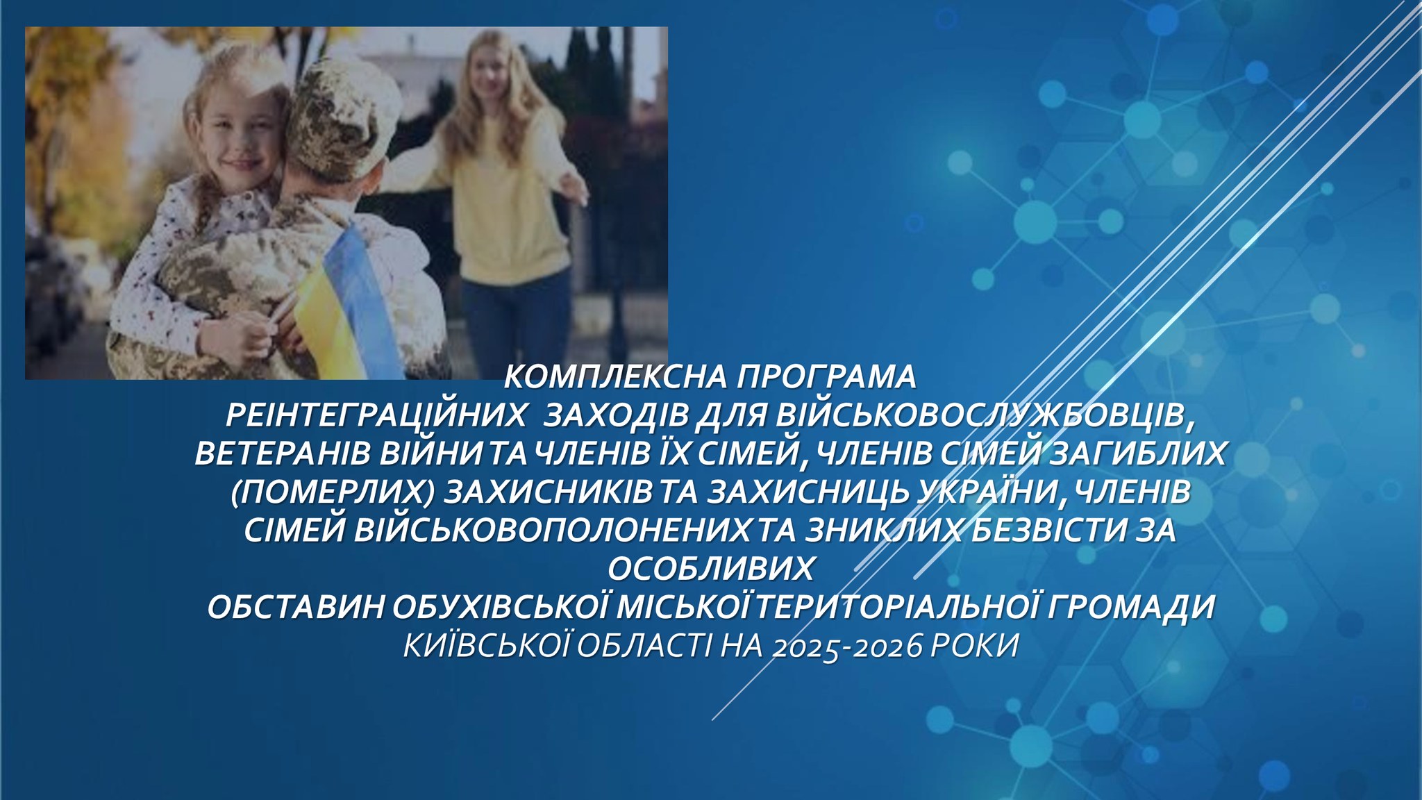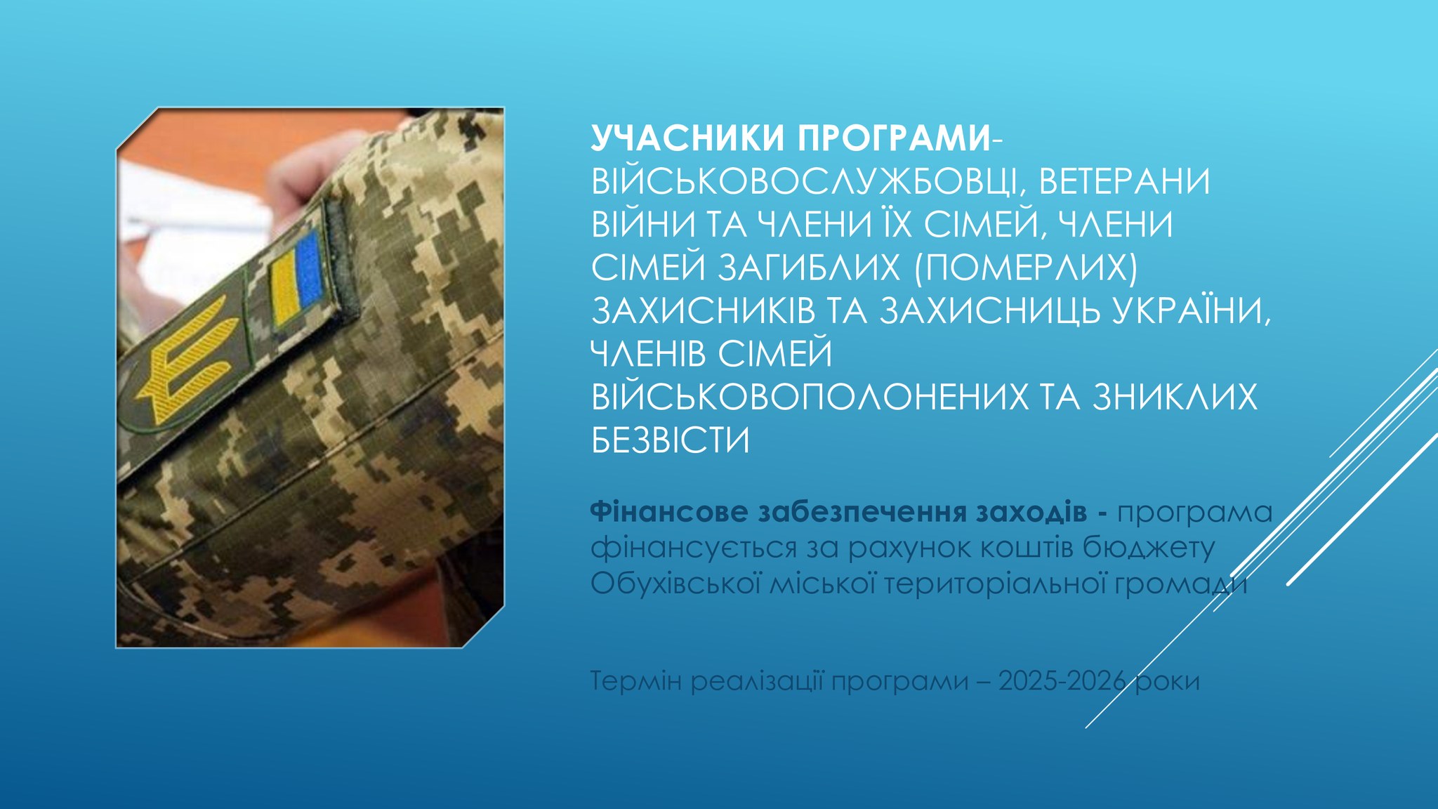 🔈Управління соціального захисту населення інформує, що рішенням Обухівської міської ради було затверджено нову програму ➡️соціально – психологічної підтримки ветеранів війни,військовослужбовців та родин загиблих Героїв,а також родин зниклих безвісти та військовополонених.