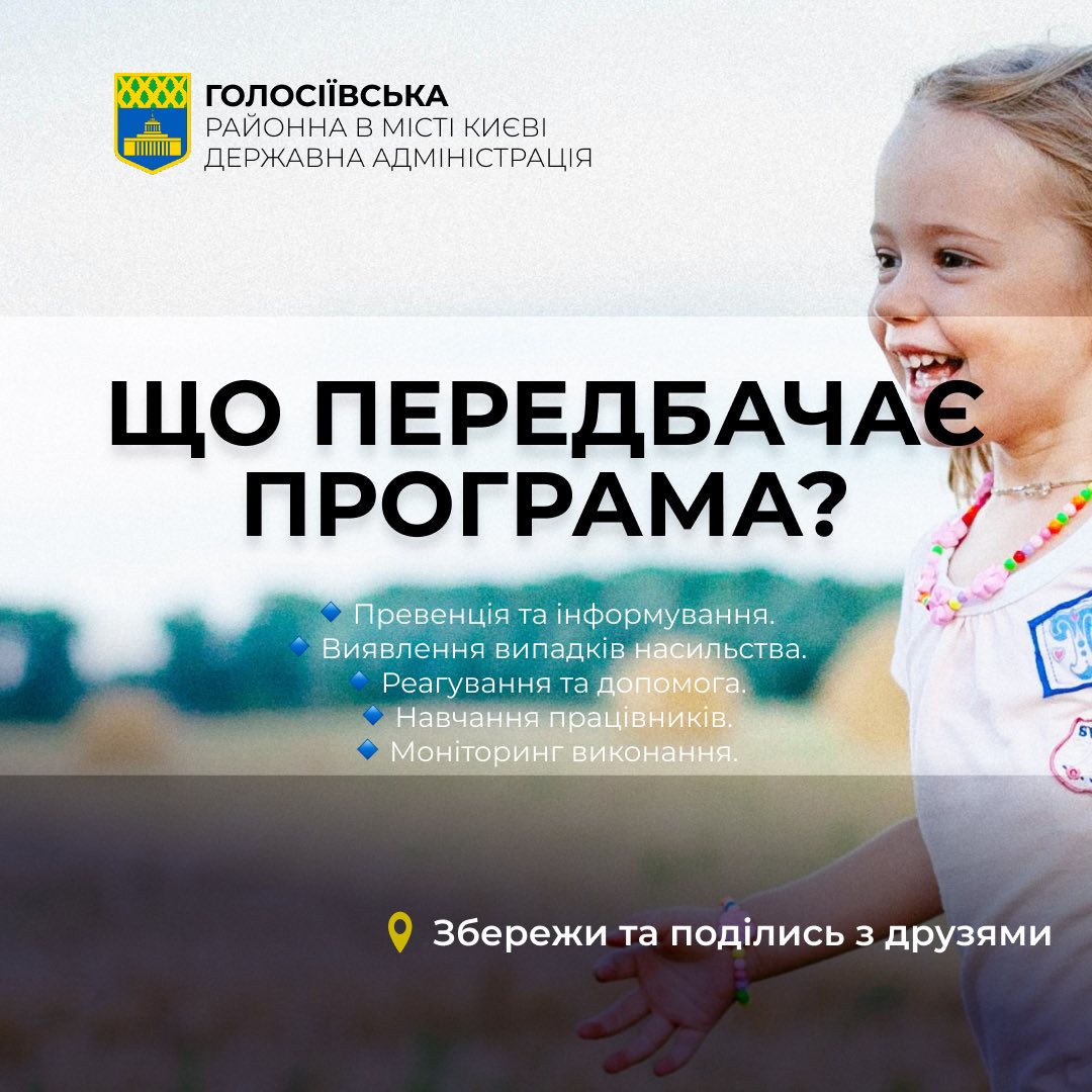 Мета програми – забезпечити кожній дитині безпечне середовище не лише вдома, а й за її межами. Програма розроблена Міністерством соціальної політики України для формування системи нульової толерантності до насильства, де кожна дитина почуватиметься захищеною.