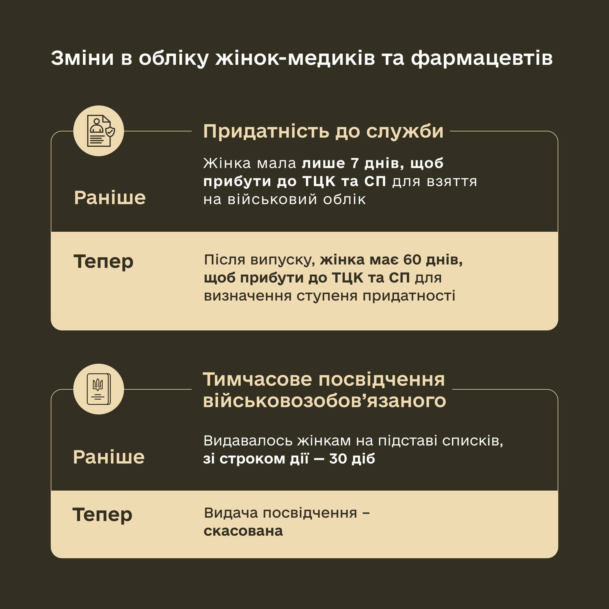 Навчальні заклади, які готують фахівців із медичною або фармацевтичною спеціальністю, тепер зобов’язані подавати списки випускниць до ТЦК та СП. Ця інформація має бути надана протягом 7 днів після випуску. Раніше цей термін був значно довшим – за 2 місяці до закінчення навчання. Швидше інформування дозволить ТЦК оперативно формувати бази даних та планувати заходи, пов’язані з мобілізацією та військовим обліком жінок відповідних спеціальностей, які є важливим ресурсом для системи оборони держави.