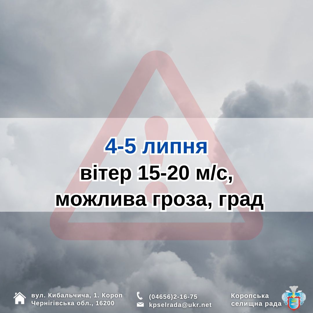 🌀⛈️4 та 5 липня за прогнозом посилення вітру до 15-20 м/с, можлива гроза, град